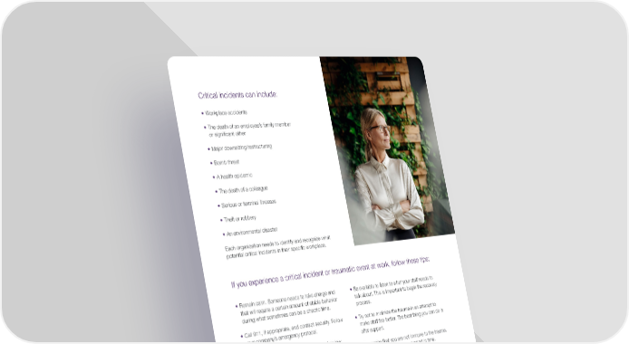 P. 18 If you experience a critical incident or traumatic event at work, follow these tips: • Remain calm. Someone needs to take charge and that will require a certain amount of stable behavior during what sometimes can be a chaotic time. • Call 911, if appropriate, and contact security. Follow your company’s emergency protocol. • Notify Human Resources of the event and review possible support services available, including your EAP, and if applicable, your internal risk response protocol. • Assess the need for on-site group crisis support. On-site debriefing services are available through your EAP. • Be available to listen to what your staff needs to talk about. This is important to begin the recovery process. • Try not to minimize the trauma in an attempt to make staff feel better. The best thing you can do is offer support. • Recognize that you are not immune to the trauma. You may require your own support in time. • Offer your staff foods that will re-hydrate and replace vitamins and minerals. Try fruits, fruit juices, vegetables and water. Critical incidents can include: • Workplace accidents • The death of an employee’s family member or significant other • Major downsizing/restructuring • Bomb threat • A health epidemic • The death of a colleague • Serious or terminal illnesses • Theft or robbery • An environmental disaster Each organization needs to identify and recognize what potential critical incidents in their specific workplace.
