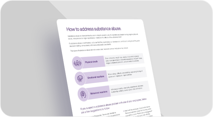 P. 19 Physical shock Emotional reactions Behavioral reactions How to address substance abuse. Substance abuse is characterized by an individual’s repeated use of a substance(s) despite having negative physical, social, interpersonal or legal experiences, related to the effects of the substance itself. If substance abuse is not treated, odds are that the dependency will increase and contribute to lost productivity, poor decision-making, unnecessary sick leave and possible accidents. • Contact Human Resources. Review and familiarize yourself with your organization’s policies and procedures on this issue • Document the behavior in your own record. This means performance issues, such as missed deadlines, quality of work, and the physical, emotional and behavioral indicators • Consult with your EAP. An expert can help you address this sensitive issue with the employee and also help develop work-related strategies to deal with the problem • Remember that only a trained clinician or health professional can formally assess the problem. Although the signs are there, there may be other explanations for the employee’s physical, emotional or behavioral symptoms Smell of alcohol, weight loss, injuries, blood-shot or glazed eyes, poor grooming or disheveled appearance, frequent illness, fatigue or stomach problems, uncoordinated movements. Mood swings, difficulty concentrating, expressing feelings of paranoia or depression, hyper-alertness. Withdrawal, hostility, unreliability, absenteeism, tardiness, relationship conflicts, slurred speech, lack of inhibition. If you suspect a substance abuse problem with one of your employees, below are a few suggestions to follow: The signs of substance abuse are not always clear, however common indicators may include: • Meet with the employee. Consult with Human Resources and also review the four-step action plan outlined under “Performance management” in this guide. If you decide to meet with the employee yourself, remember to avoid ’labeling’ and focus your discussion on the employee’s work-related performance or behavior • Reach out to your Customer Success Manager to assess the need for on-site or web-based training on addictions in the workplace