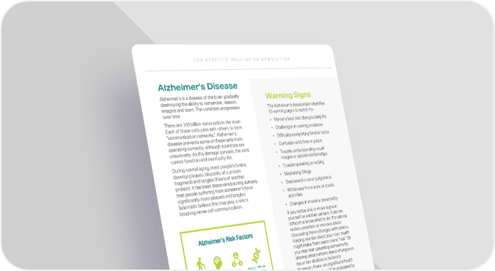 L H D B E N E F I T S W E L L - B E I N G N E W S L E T T E R Alzheimer’s Disease Alzheimer’s is a disease of the brain gradually destroying the ability to remember, reason, imagine and learn. The condition progresses over time. There are 100 billion nerve cells in the brain. Each of these cells joins with others to form “communication networks.” Alzheimer’s disease prevents some of these cells from operating correctly, although scientists are unsure why. As the damage spreads, the cells cannot function and eventually die. During normal aging, most people’s brains develop plaques (deposits of a protein fragment) and tangles (fibers of another protein). It has been discovered during autopsy that people suffering from Alzheimer’s have significantly more plaques and tangles. Scientists believe this may play a role in blocking nerve cell communication. Warning Signs The Alzheimer’s Association identifies 10 warning signs to watch for: • Memory loss that disrupts daily life • Challenges in solving problems • Difficulty completing familiar tasks • Confusion with time or place • Trouble understanding visual images or spatial relationships • Trouble speaking or writing • Misplacing things • Decreased or poor judgement • Withdrawal from work or social activities • Changes in mood or personality If you notice one or more signs in yourself or another person, it can be difficult to know what to do. It’s natural to feel uncertain or nervous about discussing these changes with others. Voicing worries about your own health might make them seem more “real.” Or you may fear upsetting someone by sharing observations about changes in his or her abilities or behavior. However, these are significant health concerns that should be evaluated by a doctor, and it’s important to take action to figure out what’s going on. Alzheimer’s Risk Factors Increasing Age Serious Head Injury Being of African- American or Latinx Descent Family History