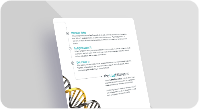 4 Pharmacists’ Review A team of pharmacists at True Rx Health Strategists examines the results and evaluates how Robert’s medications can be personalized to his needs. Pharmacogenomics is relevant to medications for many common health conditions, such as mental and heart health. 5 The Right Medication Fit Robert is noti昀椀ed through a secure website about his results. A clinician at True Rx Health Strategists reaches out to Robert and his provider to recommend a medication that will reduce side e昀昀ects and increase e昀昀ectiveness. 6 Clinical Follow-up After talking with his doctor, Robert feels con昀椀dent to try the recommended medication. Working with his doctor and the clinical team at True Rx Health Strategists, Robert receives regular monitoring to assess his health. Thanks to , Robert’s risk of heart attack and stroke is reduced, and he no longer has to take a medication with adverse side e昀昀ects. Additionally, Robert’s employer saves about $800 and reduces Robert’s risk of future medical costs such as surgeries and visits to the ER. Are you ready for smarter pharmacy solutions with ? Contact True Rx Health Strategists at sales@truerx.com. ©2021 True Rx Health Strategists 866•921•4047 sales@truerx.com truerx.com