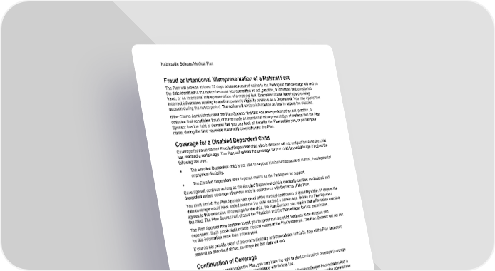 Noblesville Schools Medical Plan 73 Section 4: When Coverage Ends Fraud or Intentional Misrepresentation of a Material Fact The Plan will provide at least 30 days advance required notice to the Participant that coverage will end on the date identified in the notice because you committed an act, practice, or omission that constituted fraud, or an intentional misrepresentation of a material fact. Examples include knowingly providing incorrect information relating to another person's eligibility or status as a Dependent. You may appeal this decision during the notice period. The notice will contain information on how to appeal the decision. If the Claims Administrator and the Plan Sponsor find that you have performed an act, practice, or omission that constitutes fraud, or have made an intentional misrepresentation of material fact the Plan Sponsor has the right to demand that you pay back all Benefits the Plan paid to you, or paid in your name, during the time you were incorrectly covered under the Plan. Coverage for a Disabled Dependent Child Coverage for an unmarried Enrolled Dependent child who is disabled will not end just because the child has reached a certain age. The Plan will extend the coverage for that child beyond this age if both of the following are true: • The Enrolled Dependent child is not able to support him/herself because of mental, developmental or physical disability. • The Enrolled Dependent child depends mainly on the Participant for support. Coverage will continue as long as the Enrolled Dependent child is medically certified as disabled and dependent unless coverage otherwise ends in accordance with the terms of the Plan. You must furnish the Plan Sponsor with proof of the medical certification of disability within 31 days of the date coverage would have ended because the child reached a certain age. Before the Plan Sponsor agrees to this extension of coverage for the child, the Plan Sponsor may require that a Physician examine the child. The Plan Sponsor will choose the Physician and the Plan will pay for that examination. The Plan Sponsor may continue to ask you for proof that the child continues to be disabled and dependent. Such proof might include medical exams at the Plan's expense. The Plan Sponsor will not ask for this information more than once a year. If you do not provide proof of the child's disability and dependency within 31 days of the Plan Sponsor's request as described above, coverage for that child will end. Continuation of Coverage If your coverage ends under the Plan, you may have the right to elect continuation coverage (coverage that continues on in some form) in accordance with federal law. Continuation coverage under COBRA (the federal Consolidated Omnibus Budget Reconciliation Act) is available only to Plan Sponsors that are subject to the terms of COBRA. Contact your plan administrator to find out if your Plan Sponsor is subject to the provisions of COBRA. If you chose continuation coverage under a prior plan which was then replaced by coverage under the Plan, continuation coverage will end as scheduled under the prior plan or in accordance with federal or state law, whichever is earlier. The Claims Administrator is not the Plan Sponsor's designated "plan administrator" as that term is used in federal law, and the Claims Administrator does not assume any responsibilities of a "plan administrator" according to federal law. The Claims Administrator is not obligated to provide continuation coverage to you if the Plan Sponsor or its plan administrator fails to perform its responsibilities under federal law. Examples of the responsibilities of the Plan Sponsor or its plan administrator are: • Notifying you in a timely manner of the right to elect continuation coverage.