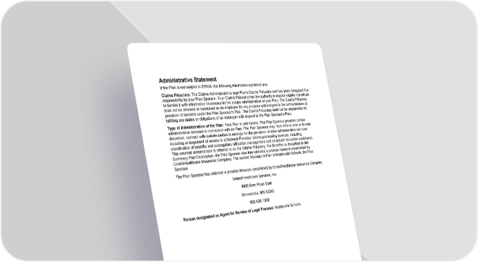 137 Federal Notice Administrative Statement If the Plan is not subject to ERISA, the following information applies to you. Claims Fiduciary: The Claims Administrator is your Plan's Claims Fiduciary and has been delegated this responsibility by your Plan Sponsor. Your Claims Fiduciary has the authority to require eligible individuals to furnish it with information necessary for the proper administration of your Plan. The Claims Fiduciary shall not be deemed or construed as an employer for any purpose with respect to the administration or provision of benefits under the Plan Sponsor's Plan. The Claims Fiduciary shall not be responsible for fulfilling any duties or obligations of an employer with respect to the Plan Sponsor's Plan. Type of Administration of the Plan: Your Plan is self-funded. The Plan Sponsor provides certain administrative services in connection with its Plan. The Plan Sponsor may, from time to time in its sole discretion, contract with outside parties to arrange for the provision of other administrative services including arrangement of access to a Network Provider; claims processing services, including coordination of benefits and subrogation; utilization management and complaint resolution assistance. This external administrator is referred to as the Claims Fiduciary. For Benefits as described in this Summary Plan Description, the Plan Sponsor also has selected a provider network established by UnitedHealthcare Insurance Company. The named fiduciary of Plan is Noblesville Schools, the Plan Sponsor. The Plan Sponsor has selected a provider Network established by UnitedHealthcare Insurance Company United Healthcare Services, Inc. 9900 Bren Road East Minnetonka, MN 55343 952-936-1300 Person designated as Agent for Service of Legal Process: Noblesville Schools