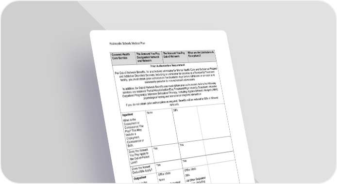 Noblesville Schools Medical Plan 23 Schedule of Benefits Set 001 Covered Health Care Service The Amount You Pay Designated Network and Network The Amount You Pay Out-of-Network What are the Limitations & Exceptions? Prior Authorization Requirement For Out-of-Network Benefits, for a scheduled admission for Mental Health Care and Substance-Related and Addictive Disorders Services, including an admission for services at a Residential Treatment facility, you must obtain prior authorization five business days before admission or as soon as is reasonably possible for non-scheduled admissions. In addition, for Out-of-Network Benefits you must obtain prior authorization before the following services are received: Partial Hospitalization/Day Treatment/High Intensity Outpatient; Intensive Outpatient Program(s); Intensive Behavioral Therapy, including Applied Behavior Analysis (ABA); psychological testing and transcranial magnetic stimulation. If you do not obtain prior authorization as required, Benefits will be reduced to 50% of Allowed Amounts. Inpatient What Is the Copayment or Coinsurance You Pay? This May Include a Copayment, Coinsurance or Both. None 30% Does the Amount You Pay Apply to the Out-of-Pocket Limit? Yes Yes Does the Annual Deductible Apply? Yes Yes Outpatient What Is the Copayment or Coinsurance You Pay? This May Include a Copayment, Coinsurance or Both. Office Visits None All Other Outpatient Services, including Partial Hospitalization/Day Treatment/High Intensity Outpatient/Intensive Outpatient Programs None Intensive Behavioral Therapy None Office Visits 30% All Other Outpatient Services, including Partial Hospitalization/Day Treatment/High Intensity Outpatient/Intensive Outpatient Programs 30% Intensive Behavioral Therapy 30%