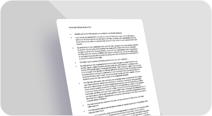 Noblesville Schools Medical Plan 97 Section 8: General Legal Provisions • Benefits paid by the Plan may also be considered to be Benefits advanced. • If you receive any payment from any party as a result of Sickness or Injury, and the Plan alleges some or all of those funds are due and owed to the Plan, you and/or your representative shall hold those funds in trust, either in a separate bank account in your name or in your representative's trust account. • By participating in and accepting Benefits under the Plan, you agree that (i) any amounts recovered by you from any third party shall constitute Plan assets (to the extent of the amount of Benefits provided on behalf of the Covered Person), (ii) you and your representative shall be fiduciaries of the Plan (within the meaning of ERISA) with respect to such amounts, and (iii) you shall be liable for and agree to pay any costs and fees (including reasonable attorney fees) incurred by the Plan to enforce its reimbursement rights. • The Plan's right to recovery will not be reduced due to your own negligence. • By participating in and accepting Benefits from the Plan, you agree to assign to the Plan any benefits, claims or rights of recovery you have under any automobile Plan - including no-fault benefits, PIP benefits and/or medical payment benefits - other coverage or against any third party, to the full extent of the Benefits the Plan has paid for the Sickness or Injury. By agreeing to provide this assignment in exchange for participating in and accepting benefits, you acknowledge and recognize the Plan's right to assert, pursue and recover on any such claim, whether or not you choose to pursue the claim, and you agree to this assignment voluntarily. • The Plan may, at its option, take necessary and appropriate action to preserve the Plan's rights under these provisions, including but not limited to, providing or exchanging medical payment information with an insurer, the insurer's legal representative or other third party; filing an ERISA reimbursement lawsuit to recover the full amount of medical benefits you receive for the Sickness or Injury out of any settlement, judgment or other recovery from any third party considered responsible; and filing suit in your name or your estate's name, which does not obligate the Plan in any way to pay you part of any recovery the Plan might obtain. Any ERISA reimbursement lawsuit stemming from a refusal to refund Benefits as required under the terms of the Plan is governed by a six-year statute of limitations. • You may not accept any settlement that does not fully reimburse the Plan, without the Plan's written approval. • The Plan has the authority and discretion to resolve all disputes regarding the interpretation of the language stated herein. • In the case of your death, giving rise to any wrongful death or survival claim, the provisions of this section apply to your estate, the personal representative of your estate, and your heirs or beneficiaries. In the case of your death the Plan's right of reimbursement and right of subrogation shall apply if a claim can be brought on behalf of you or your estate that can include a claim for past medical expenses or damages. The obligation to reimburse the Plan is not extinguished by a release of claims or settlement agreement of any kind. • No allocation of damages, settlement funds or any other recovery, by you, your estate, the personal representative of your estate, your heirs, your beneficiaries or any other person or party, shall be valid if it does not reimburse the Plan for 100% of the Plan's interest unless the Plan provides written consent to the allocation. • The provisions of this section apply to the parents, guardian, or other representative of a Dependent child who incurs a Sickness or Injury caused by any third party. If a parent or guardian brings a claim for damages arising out of a minor's Sickness or Injury, the terms of this subrogation and reimbursement clause shall apply to that claim.