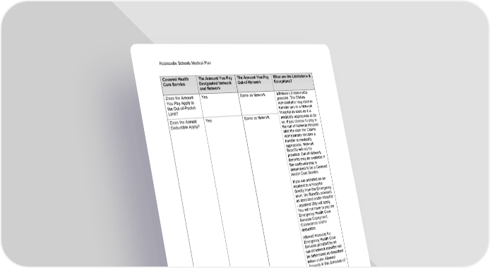Noblesville Schools Medical Plan 17 Schedule of Benefits Set 001 Covered Health Care Service The Amount You Pay Designated Network and Network The Amount You Pay Out-of-Network What are the Limitations & Exceptions? Does the Amount You Pay Apply to the Out-of-Pocket Limit? Yes Same as Network Does the Annual Deductible Apply? Yes Same as Network admission if reasonably possible. The Claims Administrator may elect to transfer you to a Network Hospital as soon as it is medically appropriate to do so. If you choose to stay in the out-of-Network Hospital after the date the Claims Administrator decides a transfer is medically appropriate, Network Benefits will not be provided. Out-of-Network Benefits may be available if the continued stay is determined to be a Covered Health Care Service. If you are admitted as an inpatient to a Hospital directly from the Emergency room, the Benefits provided as described under Hospital - Inpatient Stay will apply. You will not have to pay the Emergency Health Care Services Copayment, Coinsurance and/or deductible. Allowed Amounts for Emergency Health Care Services provided by an out-of-Network provider will be determined as described below under Allowed Amounts in this Schedule of Benefits. Enteral Nutrition What Is the Copayment or Coinsurance You Pay? This May Include a Copayment, Coinsurance or Both. None 30%