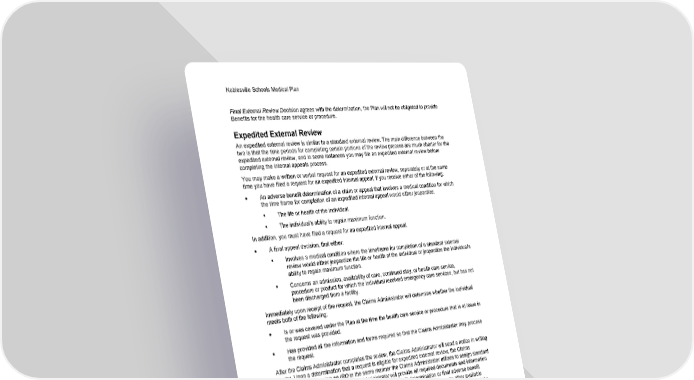 Noblesville Schools Medical Plan 81 Section 6: Questions, Complaints and Appeals Final External Review Decision agrees with the determination, the Plan will not be obligated to provide Benefits for the health care service or procedure. Expedited External Review An expedited external review is similar to a standard external review. The main difference between the two is that the time periods for completing certain portions of the review process are much shorter for the expedited external review, and in some instances you may file an expedited external review before completing the internal appeals process. You may make a written or verbal request for an expedited external review, separately or at the same time you have filed a request for an expedited internal appeal, if you receive either of the following: • An adverse benefit determination of a claim or appeal that involves a medical condition for which the time frame for completion of an expedited internal appeal would either jeopardize: ▪ The life or health of the individual. ▪ The individual's ability to regain maximum function. In addition, you must have filed a request for an expedited internal appeal. • A final appeal decision, that either: ▪ Involves a medical condition where the timeframe for completion of a standard external review would either jeopardize the life or health of the individual or jeopardize the individual's ability to regain maximum function. ▪ Concerns an admission, availability of care, continued stay, or health care service, procedure or product for which the individual received emergency care services, but has not been discharged from a facility. Immediately upon receipt of the request, the Claims Administrator will determine whether the individual meets both of the following: • Is or was covered under the Plan at the time the health care service or procedure that is at issue in the request was provided. • Has provided all the information and forms required so that the Claims Administrator may process the request. After the Claims Administrator completes the review, the Claims Administrator will send a notice in writing to you. Upon a determination that a request is eligible for expedited external review, the Claims Administrator will assign an IRO in the same manner the Claims Administrator utilizes to assign standard external reviews to IROs. The Claims Administrator will provide all required documents and information the Claims Administrator used in making the adverse benefit determination or final adverse benefit determination to the assigned IRO electronically or by telephone or facsimile or any other available method in a timely manner. The IRO, to the extent the information or documents are available and the IRO considers them appropriate, must consider the same type of information and documents considered in a standard external review. In reaching a decision, the IRO will review the claim as new and not be bound by any decisions or conclusions reached by the Claims Administrator. The IRO will provide notice of the final external review decision for an expedited external review as quickly as the claimant's medical condition or circumstances require, but in no event more than 72 hours after the IRO receives the request. If the IRO's final external review decision is first communicated verbally, the IRO will follow-up with a written confirmation of the decision within 48 hours of that verbal communication. You may call the Claims Administrator at the telephone number on your ID card for more information regarding external review rights, or if making a verbal request for an expedited external review.