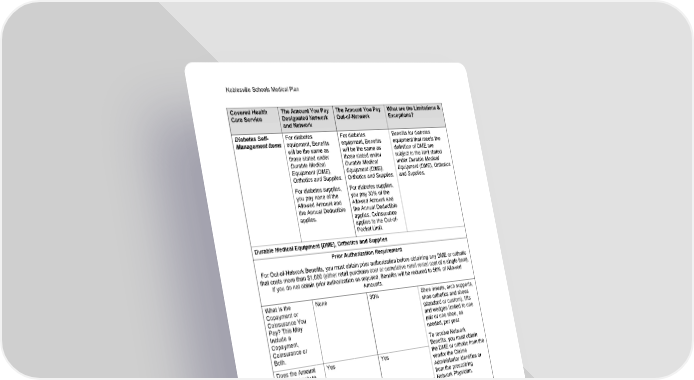 Noblesville Schools Medical Plan 16 Schedule of Benefits Set 001 Covered Health Care Service The Amount You Pay Designated Network and Network The Amount You Pay Out-of-Network What are the Limitations & Exceptions? Diabetes Self- Management Items For diabetes equipment, Benefits will be the same as those stated under Durable Medical Equipment (DME), Orthotics and Supplies. For diabetes supplies, you pay none of the Allowed Amount and the Annual Deductible applies. For diabetes equipment, Benefits will be the same as those stated under Durable Medical Equipment (DME), Orthotics and Supplies. For diabetes supplies, you pay 30% of the Allowed Amount and the Annual Deductible applies. Coinsurance applies to the Out-of- Pocket Limit. Benefits for diabetes equipment that meets the definition of DME are subject to the limit stated under Durable Medical Equipment (DME), Orthotics and Supplies. Durable Medical Equipment (DME), Orthotics and Supplies Prior Authorization Requirement For Out-of-Network Benefits, you must obtain prior authorization before obtaining any DME or orthotic that costs more than $1,000 (either retail purchase cost or cumulative retail rental cost of a single item). If you do not obtain prior authorization as required, Benefits will be reduced to 50% of Allowed Amounts. What Is the Copayment or Coinsurance You Pay? This May Include a Copayment, Coinsurance or Both. None 30% Does the Amount You Pay Apply to the Out-of-Pocket Limit? Yes Yes Does the Annual Deductible Apply? Yes Yes Shoe inserts, arch supports, shoe orthotics and shoes (standard or custom), lifts and wedges limited to one pair or one shoe, as needed, per year. To receive Network Benefits, you must obtain the DME or orthotic from the vendor the Claims Administrator identifies or from the prescribing Network Physician. Emergency Health Care Services - Outpatient What Is the Copayment or Coinsurance You Pay? This May Include a Copayment, Coinsurance or Both. None Same as Network Note: If you are confined in an out-of-Network Hospital after you receive outpatient Emergency Health Care Services, you must notify the Claims Administrator within one business day or on the same day of