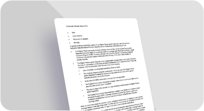 Noblesville Schools Medical Plan 71 Section 3: When Coverage Begins • Birth. • Legal adoption. • Placement for adoption. • Marriage. A special enrollment period also applies for an Eligible Person and/or Dependent who did not enroll during the Initial Enrollment Period or Open Enrollment Period if any of the following are true: • The Eligible Person previously declined coverage under the Plan, but the Eligible Person and/or Dependent becomes eligible for a premium assistance subsidy under Medicaid or Children's Health Insurance Program (CHIP). Coverage will begin only if the Plan Sponsor receives the completed enrollment form and any required contribution within 60 days of the date of determination of subsidy eligibility. • The Eligible Person and/or Dependent had existing health coverage under another plan at the time they had an opportunity to enroll during the Initial Enrollment Period or Open Enrollment Period and coverage under the prior plan ended because of any of the following: ▪ Loss of eligibility (including legal separation, divorce or death). ▪ The employer stopped paying the contributions. This is true even if the Eligible Person and/or Dependent continues to receive coverage under the prior plan and to pay the amounts previously paid by the employer. ▪ In the case of COBRA continuation coverage, the coverage ended. ▪ The Eligible Person and/or Dependent no longer resides, lives or works in an HMO service area if no other benefit option is available. ▪ The plan no longer offers benefits to a class of individuals that includes the Eligible Person and/or Dependent. ▪ The Eligible Person and/or Dependent loses eligibility under Medicaid or Children's Health Insurance Program (CHIP). Coverage will begin only if the Plan Sponsor receives the completed enrollment form and any required contribution within 60 days of the date coverage ended. When an event takes place (for example, a birth, marriage or determination of eligibility for state subsidy), coverage begins on the date of the event. The Plan Sponsor must receive the completed enrollment form and any required contribution within 31 days of the event unless otherwise noted above. For an Eligible Person and/or Dependent who did not enroll during the Initial Enrollment Period or Open Enrollment Period because they had existing health coverage under another plan, coverage begins on the day following the day coverage under the prior plan ends. Except as otherwise noted above, coverage will begin only if the Plan Sponsor receives the completed enrollment form and any required contribution within 31 days of the date coverage under the prior plan ended.