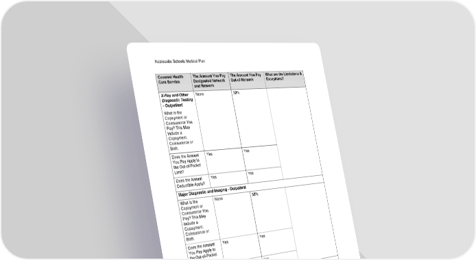 Noblesville Schools Medical Plan 22 Schedule of Benefits Set 001 Covered Health Care Service The Amount You Pay Designated Network and Network The Amount You Pay Out-of-Network What are the Limitations & Exceptions? X-Ray and Other Diagnostic Testing - Outpatient What Is the Copayment or Coinsurance You Pay? This May Include a Copayment, Coinsurance or Both. None 30% Does the Amount You Pay Apply to the Out-of-Pocket Limit? Yes Yes Does the Annual Deductible Apply? Yes Yes Major Diagnostic and Imaging - Outpatient What Is the Copayment or Coinsurance You Pay? This May Include a Copayment, Coinsurance or Both. None 30% Does the Amount You Pay Apply to the Out-of-Pocket Limit? Yes Yes Does the Annual Deductible Apply? Yes Yes Mental Health Care and Substance-Related and Addictive Disorders Services