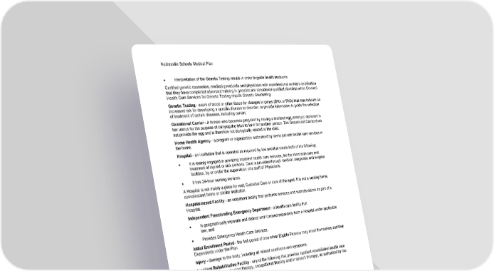 Noblesville Schools Medical Plan 105 Section 9: Defined Terms • Interpretation of the Genetic Testing results in order to guide health decisions. Certified genetic counselors, medical geneticists and physicians with a professional society's certification that they have completed advanced training in genetics are considered qualified clinicians when Covered Health Care Services for Genetic Testing require Genetic Counseling. Genetic Testing - exam of blood or other tissue for changes in genes (DNA or RNA) that may indicate an increased risk for developing a specific disease or disorder, or provide information to guide the selection of treatment of certain diseases, including cancer. Gestational Carrier - A female who becomes pregnant by having a fertilized egg (embryo) implanted in her uterus for the purpose of carrying the fetus to term for another person. The Gestational Carrier does not provide the egg and is therefore not biologically related to the child. Home Health Agency - a program or organization authorized by law to provide health care services in the home. Hospital - an institution that is operated as required by law and that meets both of the following: • It is mainly engaged in providing inpatient health care services, for the short term care and treatment of injured or sick persons. Care is provided through medical, diagnostic and surgical facilities, by or under the supervision of a staff of Physicians. • It has 24-hour nursing services. A Hospital is not mainly a place for rest, Custodial Care or care of the aged. It is not a nursing home, convalescent home or similar institution. Hospital-based Facility - an outpatient facility that performs services and submits claims as part of a Hospital. Independent Freestanding Emergency Department - a health care facility that: • Is geographically separate and distinct and licensed separately from a Hospital under applicable law; and • Provides Emergency Health Care Services. Initial Enrollment Period - the first period of time when Eligible Persons may enroll themselves and their Dependents under the Plan. Injury - damage to the body, including all related conditions and symptoms. Inpatient Rehabilitation Facility - any of the following that provides inpatient rehabilitation health care services (including physical therapy, occupational therapy and/or speech therapy), as authorized by law: • A long term acute rehabilitation center, • A Hospital, or • A special unit of a Hospital designated as an Inpatient Rehabilitation Facility. Inpatient Stay - a continuous stay that follows formal admission to a Hospital, Skilled Nursing Facility or Inpatient Rehabilitation Facility. Intensive Behavioral Therapy (IBT) - outpatient Mental Health Care Services that aim to reinforce adaptive behaviors, reduce maladaptive behaviors and improve the mastery of functional age appropriate skills in people with Autism Spectrum Disorders. The most common IBT is Applied Behavior Analysis (ABA). Intensive Outpatient Program(s) - a structured outpatient treatment program. • For Mental Health Care Services, the program may be freestanding or Hospital-based and provides services for at least three hours per day, two or more days per week.