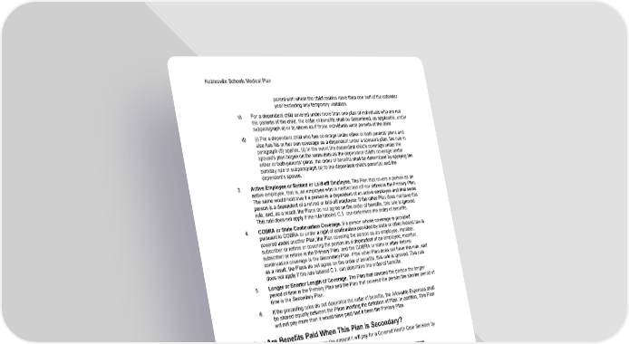 Noblesville Schools Medical Plan 86 Section 7: Coordination of Benefits parent with whom the child resides more than one half of the calendar year excluding any temporary visitation. c) For a dependent child covered under more than one plan of individuals who are not the parents of the child, the order of benefits shall be determined, as applicable, under subparagraph a) or b) above as if those individuals were parents of the child. d) (i) For a dependent child who has coverage under either or both parents' plans and also has his or her own coverage as a dependent under a spouse's plan, the rule in paragraph (5) applies. (ii) In the event the dependent child's coverage under the spouse's plan began on the same date as the dependent child's coverage under either or both parents' plans, the order of benefits shall be determined by applying the birthday rule in subparagraph (a) to the dependent child's parent(s) and the dependent's spouse. 3. Active Employee or Retired or Laid-off Employee. The Plan that covers a person as an active employee, that is, an employee who is neither laid off nor retired is the Primary Plan. The same would hold true if a person is a dependent of an active employee and that same person is a dependent of a retired or laid-off employee. If the other Plan does not have this rule, and, as a result, the Plans do not agree on the order of benefits, this rule is ignored. This rule does not apply if the rule labeled C.1. can determine the order of benefits. 4. COBRA or State Continuation Coverage. If a person whose coverage is provided pursuant to COBRA or under a right of continuation provided by state or other federal law is covered under another Plan, the Plan covering the person as an employee, member, subscriber or retiree or covering the person as a dependent of an employee, member, subscriber or retiree is the Primary Plan, and the COBRA or state or other federal continuation coverage is the Secondary Plan. If the other Plan does not have this rule, and as a result, the Plans do not agree on the order of benefits, this rule is ignored. This rule does not apply if the rule labeled C.1. can determine the order of benefits. 5. Longer or Shorter Length of Coverage. The Plan that covered the person the longer period of time is the Primary Plan and the Plan that covered the person the shorter period of time is the Secondary Plan. 6. If the preceding rules do not determine the order of benefits, the Allowable Expenses shall be shared equally between the Plans meeting the definition of Plan. In addition, This Plan will not pay more than it would have paid had it been the Primary Plan. How Are Benefits Paid When This Plan is Secondary? If this Plan is secondary, it determines the amount it will pay for a Covered Health Care Services by following the steps below. • The Plan determines the amount it would have paid based on the allowable expense. • If this Plan would have paid the same amount or less than the Primary Plan paid, this Plan pays no Benefits. • If this Plan would have paid more than the Primary Plan paid, the Plan will pay the difference. You will be responsible for any applicable Copayment, Coinsurance or Deductible payments as part of the COB payment. The maximum combined payment you can receive from all plans may be less than 100% of the allowable expense. How is the Allowable Expense Determined when this Plan is Secondary? Determining the Allowable Expense If this Plan is Secondary