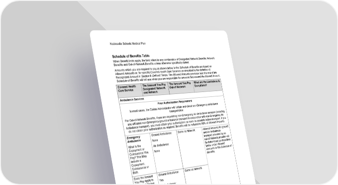 Noblesville Schools Medical Plan 12 Schedule of Benefits Set 001 Schedule of Benefits Table When Benefit limits apply, the limit refers to any combination of Designated Network Benefits, Network Benefits and Out-of-Network Benefits unless otherwise specifically stated. Amounts which you are required to pay as shown below in the Schedule of Benefits are based on Allowed Amounts or, for specific Covered Health Care Services as described in the definition of Recognized Amount in Section 9: Defined Terms. The Allowed Amounts provision near the end of this Schedule of Benefits will tell you when you are responsible for amounts that exceed the Allowed Amount. Covered Health Care Service The Amount You Pay Designated Network and Network The Amount You Pay Out-of-Network What are the Limitations & Exceptions? Ambulance Services Prior Authorization Requirement In most cases, the Claims Administrator will initiate and direct non-Emergency ambulance transportation. For Out-of-Network Benefits, if you are requesting non-Emergency Air Ambulance services (including any affiliated non-Emergency ground ambulance transport in conjunction with non-Emergency Air Ambulance transport), you must obtain prior authorization as soon as possible before transport. If you do not obtain prior authorization as required, Benefits will be reduced to 50% of Allowed Amounts. Emergency Ambulance What Is the Copayment or Coinsurance You Pay? This May Include a Copayment, Coinsurance or Both. Ground Ambulance: None Air Ambulance: None Same as Network Does the Amount You Pay Apply to the Out-of-Pocket Limit? Ground Ambulance: Yes Air Ambulance: Yes Same as Network Does the Annual Deductible Apply? Ground Ambulance: Yes Air Ambulance: Yes Same as Network Allowed Amounts for ground and Air Ambulance transport provided by an out-of-Network provider will be determined as described below under Allowed Amounts in this Schedule of Benefits.