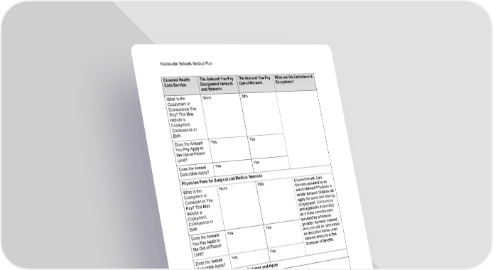 Noblesville Schools Medical Plan 26 Schedule of Benefits Set 001 Covered Health Care Service The Amount You Pay Designated Network and Network The Amount You Pay Out-of-Network What are the Limitations & Exceptions? What Is the Copayment or Coinsurance You Pay? This May Include a Copayment, Coinsurance or Both. None 30% Does the Amount You Pay Apply to the Out-of-Pocket Limit? Yes Yes Does the Annual Deductible Apply? Yes Yes Physician Fees for Surgical and Medical Services What Is the Copayment or Coinsurance You Pay? This May Include a Copayment, Coinsurance or Both. None 30% Does the Amount You Pay Apply to the Out-of-Pocket Limit? Yes Yes Does the Annual Deductible Apply? Yes Yes Covered Health Care Services provided by an out-of-Network Physician in certain Network facilities will apply the same cost sharing (Copayment, Coinsurance and applicable deductible) as if those services were provided by a Network provider; however Allowed Amounts will be determined as described below under Allowed Amounts in this Schedule of Benefits. Physician's Office Services - Sickness and Injury What Is the Copayment or Coinsurance You Pay? This May Include a Copayment, Coinsurance or Both. None 30% Does the Amount You Pay Apply to the Out-of-Pocket Limit? Yes Yes