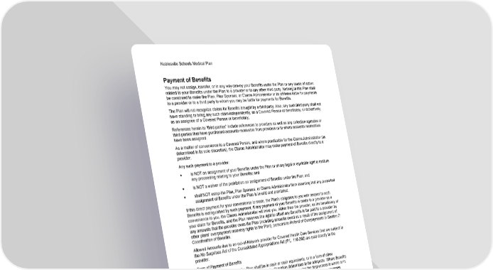 Noblesville Schools Medical Plan 76 Section 5: How to File a Claim Payment of Benefits You may not assign, transfer, or in any way convey your Benefits under the Plan or any cause of action related to your Benefits under the Plan to a provider or to any other third party. Nothing in this Plan shall be construed to make the Plan, Plan Sponsor, or Claims Administrator or its affiliates liable for payments to a provider or to a third party to whom you may be liable for payments for Benefits. The Plan will not recognize claims for Benefits brought by a third party. Also, any such third party shall not have standing to bring any such claim independently, as a Covered Person or beneficiary, or derivatively, as an assignee of a Covered Person or beneficiary. References herein to "third parties" include references to providers as well as any collection agencies or third parties that have purchased accounts receivable from providers or to whom accounts receivables have been assigned. As a matter of convenience to a Covered Person, and where practicable for the Claims Administrator (as determined in its sole discretion), the Claims Administrator may make payment of Benefits directly to a provider. Any such payment to a provider: • is NOT an assignment of your Benefits under the Plan or of any legal or equitable right to institute any proceeding relating to your Benefits; and • is NOT a waiver of the prohibition on assignment of Benefits under the Plan; and • shall NOT estop the Plan, Plan Sponsor, or Claims Administrator from asserting that any purported assignment of Benefits under the Plan is invalid and prohibited. If this direct payment for your convenience is made, the Plan's obligation to you with respect to such Benefits is extinguished by such payment. If any payment of your Benefits is made to a provider as a convenience to you, the Claims Administrator will treat you, rather than the provider, as the beneficiary of your claim for Benefits, and the Plan reserves the right to offset any Benefits to be paid to a provider by any amounts that the provider owes the Plan (including amounts owed as a result of the assignment of other plans' overpayment recovery rights to the Plan), pursuant to Refund of Overpayments in Section 7: Coordination of Benefits. Allowed Amounts due to an out-of-Network provider for Covered Health Care Services that are subject to the No Surprises Act of the Consolidated Appropriations Act (P.L. 116-260) are paid directly to the provider. Form of Payment of Benefits Payment of Benefits under the Plan shall be in cash or cash equivalents, or in a form of other consideration that the Claims Administrator in its discretion determines to be adequate. Where Benefits are payable directly to a provider, such adequate consideration includes the forgiveness in whole or in part of the amount the provider owes to other plans for which the Claims Administrator processes payments, where the Plan has taken an assignment of the other plans' recovery rights for value.