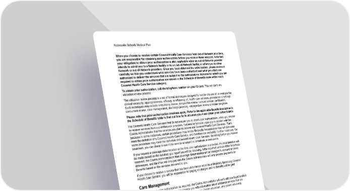 Noblesville Schools Medical Plan 8 Schedule of Benefits Set 001 When you choose to receive certain Covered Health Care Services from out-of-Network providers, you are responsible for obtaining prior authorization before you receive these services. Note that your obligation to obtain prior authorization is also applicable when an out-of-Network provider intends to admit you to a Network facility or to an out-of-Network facility or refers you to other Network or out-of-Network providers. Once you have obtained the authorization, please review it carefully so that you understand what services have been authorized and what providers are authorized to deliver the services that are subject to the authorization. Services for which you are required to obtain prior authorization are shown in the Schedule of Benefits table within each Covered Health Care Service category. To obtain prior authorization, call the telephone number on your ID card. This call starts the utilization review process. The utilization review process is a set of formal techniques designed to monitor the use of, or evaluate the clinical necessity, appropriateness, efficacy, or efficiency of, health care services, procedures or settings. Such techniques may include ambulatory review, prospective review, second opinion, certification, concurrent review, case management, discharge planning, retrospective review or similar programs. Please note that prior authorization timelines apply. Refer to the applicable Benefit description in the Schedule of Benefits table to find out how far in advance you must obtain prior authorization. For Covered Health Care Services that do not require you to obtain prior authorization, when you choose to receive services from out-of-Network providers, Noblesville Schools urges you to confirm with the Claims Administrator that the services you plan to receive are Covered Health Care Services. That's because in some instances, certain procedures may not be Medically Necessary or may not otherwise meet the definition of a Covered Health Care Service, and therefore are excluded. In other instances, the same procedure may meet the definition of Covered Health Care Services. By calling before you receive treatment, you can check to see if the service is subject to limitations or exclusions. If you request a coverage determination at the time prior authorization is provided, the determination will be made based on the services you report you will be receiving. If the reported services differ from those received, the Claims Administrator's final coverage determination will be changed to account for those differences, and the Plan will only pay and the Claims Administrator will only process payments for Benefits based on the services delivered to you. If you choose to receive a service that has been determined not to be a Medically Necessary Covered Health Care Service, you will be responsible for paying all charges and no Benefits will be paid. Care Management When you seek prior authorization as required, the Claims Administrator will work with you to put in place the care management process and to provide you with information about additional services that are available to you, such as disease management programs, health education, and patient advocacy. Special Note Regarding Medicare If you are enrolled in Medicare on a primary basis (Medicare pays before the Claims Administrator processes payments for Benefits under the Plan), the prior authorization requirements do not apply to you. Since Medicare is the primary payer, the Claims Administrator will process payments for the Plan as secondary payer as described in Section 7: Coordination of Benefits. You are not required to obtain prior authorization before receiving Covered Health Care Services. What Will You Pay for Covered Health Care Services? Benefits for Covered Health Care Services are described in the tables below. Annual Deductibles are calculated on a calendar year basis. Out-of-Pocket Limits are calculated on a calendar year basis.