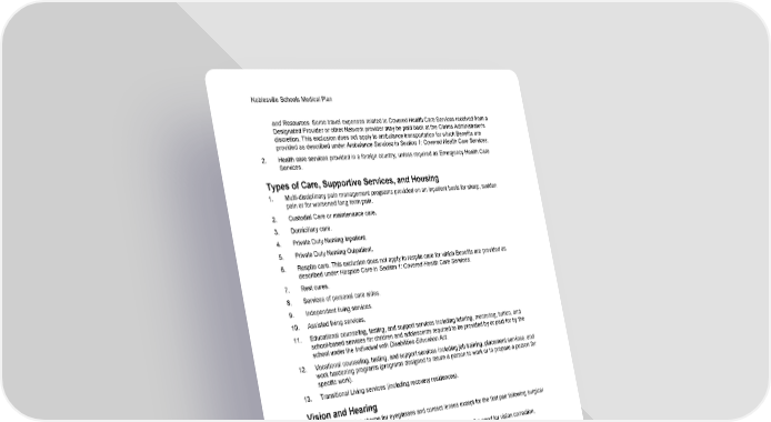Noblesville Schools Medical Plan 65 Section 2: Exclusions and Limitations and Resources. Some travel expenses related to Covered Health Care Services received from a Designated Provider or other Network provider may be paid back at the Claims Administrator's discretion. This exclusion does not apply to ambulance transportation for which Benefits are provided as described under Ambulance Services in Section 1: Covered Health Care Services. 2. Health care services provided in a foreign country, unless required as Emergency Health Care Services. Types of Care, Supportive Services, and Housing 1. Multi-disciplinary pain management programs provided on an inpatient basis for sharp, sudden pain or for worsened long term pain. 2. Custodial Care or maintenance care. 3. Domiciliary care. 4. Private Duty Nursing Inpatient. 5. Private Duty Nursing Outpatient. 6. Respite care. This exclusion does not apply to respite care for which Benefits are provided as described under Hospice Care in Section 1: Covered Health Care Services. 7. Rest cures. 8. Services of personal care aides. 9. Independent living services. 10. Assisted living services. 11. Educational counseling, testing, and support services including tutoring, mentoring, tuition, and school-based services for children and adolescents required to be provided by or paid for by the school under the Individual with Disabilities Education Act. 12. Vocational counseling, testing, and support services including job training, placement services, and work hardening programs (programs designed to return a person to work or to prepare a person for specific work). 13. Transitional Living services (including recovery residences). Vision and Hearing 1. Cost and fitting charge for eyeglasses and contact lenses except for the first pair following surgical removal of the lens(es) of the eyes. 2. Routine vision exams, including refractive exams to determine the need for vision correction. 3. Implantable lenses used only to fix a refractive error (such as Intacs corneal implants). 4. Eye exercise or vision therapy. 5. Surgery that is intended to allow you to see better without glasses or other vision correction. Examples include radial keratotomy, laser and other refractive eye surgery. 6. Cost and related fitting and testing charges for hearing aids, bone anchored hearing aids and all other hearing assistive devices. 7. Over-the-counter hearing aids.