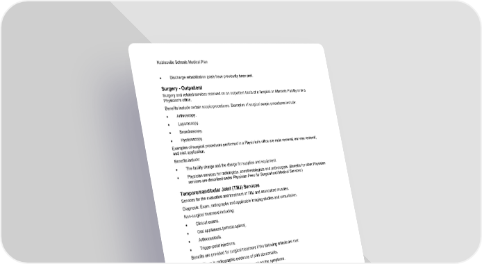 Noblesville Schools Medical Plan 53 Section 1: Covered Health Care Services • Discharge rehabilitation goals have previously been met. Surgery - Outpatient Surgery and related services received on an outpatient basis at a Hospital or Alternate Facility or in a Physician's office. Benefits include certain scopic procedures. Examples of surgical scopic procedures include: • Arthroscopy. • Laparoscopy. • Bronchoscopy. • Hysteroscopy. Examples of surgical procedures performed in a Physician's office are mole removal, ear wax removal, and cast application. Benefits include: • The facility charge and the charge for supplies and equipment. • Physician services for radiologists, anesthesiologists and pathologists. (Benefits for other Physician services are described under Physician Fees for Surgical and Medical Services.) Temporomandibular Joint (TMJ) Services Services for the evaluation and treatment of TMJ and associated muscles. Diagnosis: Exam, radiographs and applicable imaging studies and consultation. Non-surgical treatment including: • Clinical exams. • Oral appliances (orthotic splints). • Arthrocentesis. • Trigger-point injections. Benefits are provided for surgical treatment if the following criteria are met: • There is radiographic evidence of joint abnormality. • Non-surgical treatment has not resolved the symptoms. • Pain or dysfunction is moderate or severe. Benefits for surgical services include: • Arthrocentesis. • Arthroscopy. • Arthroplasty. • Arthrotomy. • Open or closed reduction of dislocations. Benefits for surgical services also include FDA-approved TMJ prosthetic replacements when all other treatment has failed.