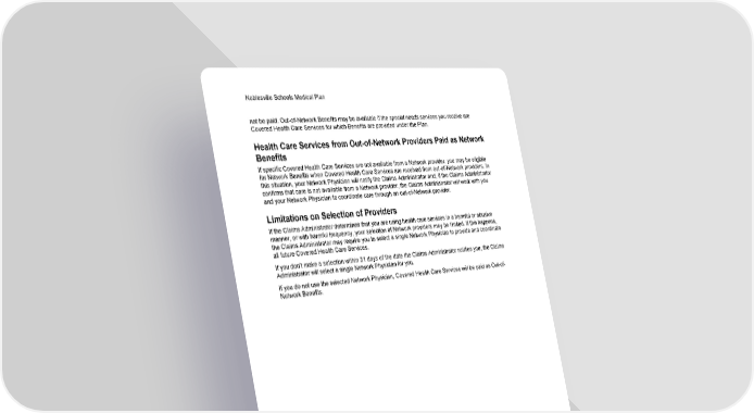 Noblesville Schools Medical Plan 38 Schedule of Benefits Set 001 not be paid. Out-of-Network Benefits may be available if the special needs services you receive are Covered Health Care Services for which Benefits are provided under the Plan. Health Care Services from Out-of-Network Providers Paid as Network Benefits If specific Covered Health Care Services are not available from a Network provider, you may be eligible for Network Benefits when Covered Health Care Services are received from out-of-Network providers. In this situation, your Network Physician will notify the Claims Administrator and, if the Claims Administrator confirms that care is not available from a Network provider, the Claims Administrator will work with you and your Network Physician to coordinate care through an out-of-Network provider. Limitations on Selection of Providers If the Claims Administrator determines that you are using health care services in a harmful or abusive manner, or with harmful frequency, your selection of Network providers may be limited. If this happens, the Claims Administrator may require you to select a single Network Physician to provide and coordinate all future Covered Health Care Services. If you don't make a selection within 31 days of the date the Claims Administrator notifies you, the Claims Administrator will select a single Network Physician for you. If you do not use the selected Network Physician, Covered Health Care Services will be paid as Out-of- Network Benefits.