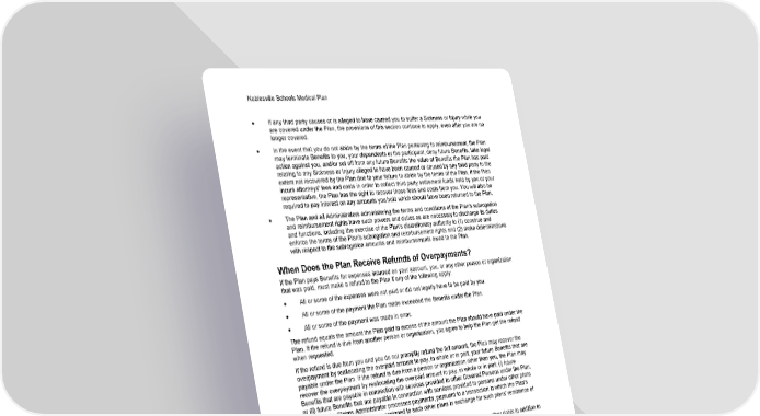 Noblesville Schools Medical Plan 97 Section 8: General Legal Provisions • If any third party causes or is alleged to have caused you to suffer a Sickness or Injury while you are covered under the Plan, the provisions of this section continue to apply, even after you are no longer covered. • In the event that you do not abide by the terms of the Plan pertaining to reimbursement, the Plan may terminate Benefits to you, your dependents or the participant, deny future Benefits, take legal action against you, and/or set off from any future Benefits the value of Benefits the Plan has paid relating to any Sickness or Injury alleged to have been caused or caused by any third party to the extent not recovered by the Plan due to your failure to abide by the terms of the Plan. If the Plan incurs attorneys' fees and costs in order to collect third party settlement funds held by you or your representative, the Plan has the right to recover those fees and costs from you. You will also be required to pay interest on any amounts you hold which should have been returned to the Plan. • The Plan and all Administrators administering the terms and conditions of the Plan's subrogation and reimbursement rights have such powers and duties as are necessary to discharge its duties and functions, including the exercise of the Plan's discretionary authority to (1) construe and enforce the terms of the Plan's subrogation and reimbursement rights and (2) make determinations with respect to the subrogation amounts and reimbursements owed to the Plan. When Does the Plan Receive Refunds of Overpayments? If the Plan pays Benefits for expenses incurred on your account, you, or any other person or organization that was paid, must make a refund to the Plan if any of the following apply: • All or some of the expenses were not paid or did not legally have to be paid by you. • All or some of the payment the Plan made exceeded the Benefits under the Plan. • All or some of the payment was made in error. The refund equals the amount the Plan paid in excess of the amount the Plan should have paid under the Plan. If the refund is due from another person or organization, you agree to help the Plan get the refund when requested. If the refund is due from you and you do not promptly refund the full amount, the Plan may recover the overpayment by reallocating the overpaid amount to pay, in whole or in part, your future Benefits that are payable under the Plan. If the refund is due from a person or organization other than you, the Plan may recover the overpayment by reallocating the overpaid amount to pay, in whole or in part; (i) future Benefits that are payable in connection with services provided to other Covered Persons under the Plan; or (ii) future Benefits that are payable in connection with services provided to persons under other plans for which the Claims Administrator processes payments, pursuant to a transaction in which the Plan's overpayment recovery rights are assigned to such other plans in exchange for such plans' remittance of the amount of the reallocated payment. The reductions will equal the amount of the required refund. The Plan may have other rights in addition to the right to reduce future benefits. Is There a Limitation of Action? You cannot bring any legal action against the Plan or the Claims Administrator to recover reimbursement until you have completed all the steps in the appeal process described in Section 6: Questions, Complaints and Appeals. After completing that process, if you want to bring a legal action against the Plan or the Claims Administrator you must do so within three years of the date the Plan notified you of its final decision on your appeal or you lose any rights to bring such an action against the Plan or the Claims Administrator.