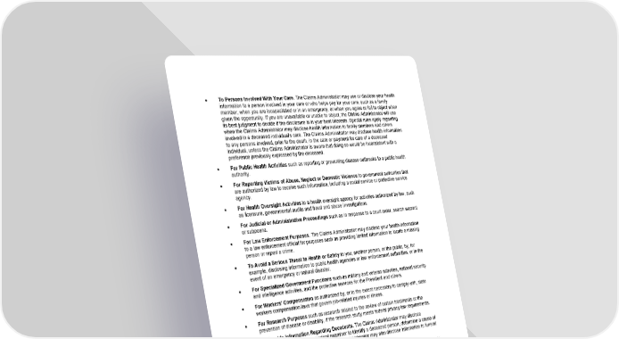 131 Federal Notice • To Persons Involved With Your Care. The Claims Administrator may use or disclose your health information to a person involved in your care or who helps pay for your care, such as a family member, when you are incapacitated or in an emergency, or when you agree or fail to object when given the opportunity. If you are unavailable or unable to object, the Claims Administrator will use its best judgment to decide if the disclosure is in your best interests. Special rules apply regarding when the Claims Administrator may disclose health information to family members and others involved in a deceased individual's care. The Claims Administrator may disclose health information to any persons involved, prior to the death, in the care or payment for care of a deceased individual, unless the Claims Administrator is aware that doing so would be inconsistent with a preference previously expressed by the deceased. • For Public Health Activities such as reporting or preventing disease outbreaks to a public health authority. • For Reporting Victims of Abuse, Neglect or Domestic Violence to government authorities that are authorized by law to receive such information, including a social service or protective service agency. • For Health Oversight Activities to a health oversight agency for activities authorized by law, such as licensure, governmental audits and fraud and abuse investigations. • For Judicial or Administrative Proceedings such as in response to a court order, search warrant or subpoena. • For Law Enforcement Purposes. The Claims Administrator may disclose your health information to a law enforcement official for purposes such as providing limited information to locate a missing person or report a crime. • To Avoid a Serious Threat to Health or Safety to you, another person, or the public, by, for example, disclosing information to public health agencies or law enforcement authorities, or in the event of an emergency or natural disaster. • For Specialized Government Functions such as military and veteran activities, national security and intelligence activities, and the protective services for the President and others. • For Workers' Compensation as authorized by, or to the extent necessary to comply with, state workers compensation laws that govern job-related injuries or illness. • For Research Purposes such as research related to the review of certain treatments or the prevention of disease or disability, if the research study meets federal privacy law requirements. • To Provide Information Regarding Decedents. The Claims Administrator may disclose information to a coroner or medical examiner to identify a deceased person, determine a cause of death, or as authorized by law. The Claims Administrator may also disclose information to funeral directors as needed to carry out their duties. • For Organ Procurement Purposes. The Claims Administrator may use or disclose information to entities that handle procurement, banking or transplantation of organs, eyes or tissue to facilitate donation and transplantation. • To Correctional Institutions or Law Enforcement Officials if you are an inmate of a correctional institution or under the custody of a law enforcement official, but only if needed (1) for the institution to provide you with health care; (2) to protect your health and safety or the health and safety of others; or (3) for the safety and security of the correctional institution. • To Business Associates that perform functions on the Claims Administrator's behalf or provide the Claims Administrator with services if the information is needed for such functions or services. The Claims Administrator's business associates are required, under contract with the Claims Administrator, and according to federal law, to protect the privacy of your information and are not