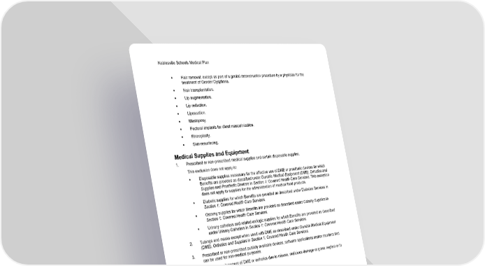 Noblesville Schools Medical Plan 60 Section 2: Exclusions and Limitations ▪ Hair removal, except as part of a genital reconstruction procedure by a physician for the treatment of Gender Dysphoria. ▪ Hair transplantation. ▪ Lip augmentation. ▪ Lip reduction. ▪ Liposuction. ▪ Mastopexy. ▪ Pectoral implants for chest masculinization. ▪ Rhinoplasty. ▪ Skin resurfacing. Medical Supplies and Equipment 1. Prescribed or non-prescribed medical supplies and certain disposable supplies. This exclusion does not apply to: ▪ Disposable supplies necessary for the effective use of DME or prosthetic devices for which Benefits are provided as described under Durable Medical Equipment (DME), Orthotics and Supplies and Prosthetic Devices in Section 1: Covered Health Care Services. This exception does not apply to supplies for the administration of medical food products. ▪ Diabetic supplies for which Benefits are provided as described under Diabetes Services in Section 1: Covered Health Care Services. ▪ Ostomy supplies for which Benefits are provided as described under Ostomy Supplies in Section 1: Covered Health Care Services. ▪ Urinary catheters and related urologic supplies for which Benefits are provided as described under Urinary Catheters in Section 1: Covered Health Care Services. 2. Tubings and masks except when used with DME as described under Durable Medical Equipment (DME), Orthotics and Supplies in Section 1: Covered Health Care Services. 3. Prescribed or non-prescribed publicly available devices, software applications and/or monitors that can be used for non-medical purposes. 4. Repair or replacement of DME or orthotics due to misuse, malicious damage or gross neglect or to replace lost or stolen items. Nutrition 1. Non-preventive nutritional counseling that is non-disease specific nutritional education such as general good eating habits. This exclusion does not apply to preventive care for which Benefits are provided under the United States Preventive Services Task Force or to Benefits provided under Non-Preventive Nutritional Counseling as described in Section 1: Covered Health Care Services. 2. Food of any kind, infant formula, standard milk-based formula, and donor breast milk. This exclusion does not apply to specialized enteral formula for which Benefits are provided as described under Enteral Nutrition in Section 1: Covered Health Care Services. 3. Nutritional or cosmetic therapy using high dose or mega quantities of vitamins, minerals or elements and other nutrition-based therapy. Examples include supplements and electrolytes.