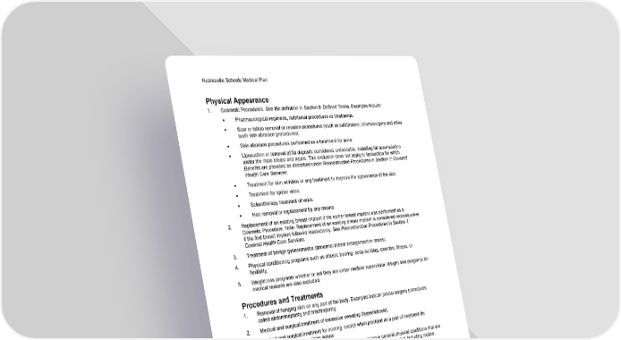 Noblesville Schools Medical Plan 62 Section 2: Exclusions and Limitations Physical Appearance 1. Cosmetic Procedures. See the definition in Section 9: Defined Terms. Examples include: ▪ Pharmacological regimens, nutritional procedures or treatments. ▪ Scar or tattoo removal or revision procedures (such as salabrasion, chemosurgery and other such skin abrasion procedures). ▪ Skin abrasion procedures performed as a treatment for acne. ▪ Liposuction or removal of fat deposits considered undesirable, including fat accumulation under the male breast and nipple. This exclusion does not apply to liposuction for which Benefits are provided as described under Reconstructive Procedures in Section 1: Covered Health Care Services. ▪ Treatment for skin wrinkles or any treatment to improve the appearance of the skin. ▪ Treatment for spider veins. ▪ Sclerotherapy treatment of veins. ▪ Hair removal or replacement by any means. 2. Replacement of an existing breast implant if the earlier breast implant was performed as a Cosmetic Procedure. Note: Replacement of an existing breast implant is considered reconstructive if the first breast implant followed mastectomy. See Reconstructive Procedures in Section 1: Covered Health Care Services. 3. Treatment of benign gynecomastia (abnormal breast enlargement in males). 4. Physical conditioning programs such as athletic training, body-building, exercise, fitness, or flexibility. 5. Weight loss programs whether or not they are under medical supervision. Weight loss programs for medical reasons are also excluded. Procedures and Treatments 1. Removal of hanging skin on any part of the body. Examples include plastic surgery procedures called abdominoplasty and brachioplasty. 2. Medical and surgical treatment of excessive sweating (hyperhidrosis). 3. Medical and surgical treatment for snoring, except when provided as a part of treatment for documented obstructive sleep apnea. 4. Rehabilitation services and Manipulative Treatment to improve general physical conditions that are provided to reduce potential risk factors, where improvement is not expected, including routine, long-term or maintenance/preventive treatment. 5. Habilitative services or therapies for the purpose of general well-being or condition in the absence of a medical or behavioral disabling condition. 6. Physiological treatments and procedures that result in the same therapeutic effects when performed on the same body region during the same visit or office encounter. 7. Biofeedback. 8. The following services for the diagnosis and treatment of TMJ: surface electromyography; Doppler analysis; vibration analysis; computerized mandibular scan or jaw tracking; craniosacral therapy; orthodontics; occlusal adjustment; and dental restorations.