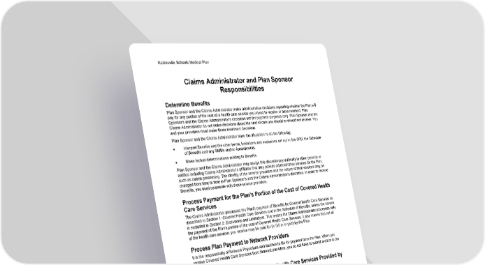 Noblesville Schools Medical Plan 5 Claims Administrator and Plan Sponsor Responsibilities Claims Administrator and Plan Sponsor Responsibilities Determine Benefits Plan Sponsor and the Claims Administrator make administrative decisions regarding whether the Plan will pay for any portion of the cost of a health care service you intend to receive or have received. Plan Sponsor's and the Claims Administrator's decisions are for payment purposes only. Plan Sponsor and the Claims Administrator do not make decisions about the kind of care you should or should not receive. You and your providers must make those treatment decisions. Plan Sponsor and the Claims Administrator have the discretion to do the following: • Interpret Benefits and the other terms, limitations and exclusions set out in this SPD, the Schedule of Benefits and any SMMs and/or Amendments. • Make factual determinations relating to Benefits. Plan Sponsor and the Claims Administrator may assign this discretionary authority to other persons or entities including Claims Administrator's affiliates that may provide administrative services for the Plan, such as claims processing. The identity of the service providers and the nature of their services may be changed from time to time in Plan Sponsor's and the Claims Administrator's discretion. In order to receive Benefits, you must cooperate with those service providers. Process Payment for the Plan's Portion of the Cost of Covered Health Care Services The Claims Administrator processes the Plan's payment of Benefits for Covered Health Care Services as described in Section 1: Covered Health Care Services and in the Schedule of Benefits, unless the service is excluded in Section 2: Exclusions and Limitations. This means the Claims Administrator processes only the payment of the Plan's portion of the cost of Covered Health Care Services. It also means that not all of the health care services you receive may be paid for (in full or in part) by the Plan. Process Plan Payment to Network Providers It is the responsibility of Network Physicians and facilities to file for payment from the Plan. When you receive Covered Health Care Services from Network providers, you do not have to submit a claim to the Plan. Process Plan Payment for Covered Health Care Services Provided by Out-of-Network Providers The Claims Administrator processes the Plan's payment of Benefits after receiving your request for payment that includes all required information. See Section 5: How to File a Claim. Review and Determine Benefits in Accordance with the Claims Administrator's Reimbursement Policies The Claims Administrator adjudicates claims consistent with industry standards. The Claims Administrator develops its reimbursement policy guidelines, in its sole discretion, generally in accordance with one or more of the following methodologies: • As shown in the most recent edition of the Current Procedural Terminology (CPT), a publication of the American Medical Association, and/or the Centers for Medicare and Medicaid Services (CMS).