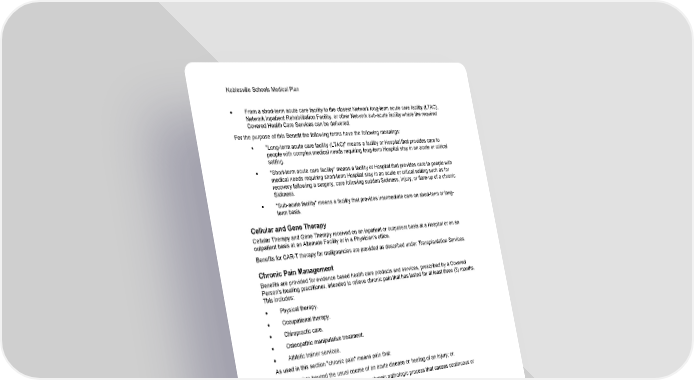 Noblesville Schools Medical Plan 40 Section 1: Covered Health Care Services • From a short-term acute care facility to the closest Network long-term acute care facility (LTAC), Network Inpatient Rehabilitation Facility, or other Network sub-acute facility where the required Covered Health Care Services can be delivered. For the purpose of this Benefit the following terms have the following meanings: ▪ "Long-term acute care facility (LTAC)" means a facility or Hospital that provides care to people with complex medical needs requiring long-term Hospital stay in an acute or critical setting. ▪ "Short-term acute care facility" means a facility or Hospital that provides care to people with medical needs requiring short-term Hospital stay in an acute or critical setting such as for recovery following a surgery, care following sudden Sickness, Injury, or flare-up of a chronic Sickness. ▪ "Sub-acute facility" means a facility that provides intermediate care on short-term or long- term basis. Cellular and Gene Therapy Cellular Therapy and Gene Therapy received on an inpatient or outpatient basis at a Hospital or on an outpatient basis at an Alternate Facility or in a Physician's office. Benefits for CAR-T therapy for malignancies are provided as described under Transplantation Services. Chronic Pain Management Benefits are provided for evidence based health care products and services, prescribed by a Covered Person's treating practitioner, intended to relieve chronic pain that has lasted for at least three (3) months. This includes: • Physical therapy. • Occupational therapy. • Chiropractic care. • Osteopathic manipulative treatment. • Athletic trainer services. As used in this section "chronic pain" means pain that: • Persists beyond the usual course of an acute disease or healing of an Injury; or. • May be associated with an acute or chronic pathologic process that causes continuous or intermittent pain for a period of months or years. Clinical Trials Routine patient care costs incurred while taking part in a qualifying clinical trial for the treatment of: • Cancer or other life-threatening disease or condition. For purposes of this Benefit, a life-threatening disease or condition is one which is likely to cause death unless the course of the disease or condition is interrupted. • Cardiovascular disease (cardiac/stroke) which is not life threatening, when the Claims Administrator determines the clinical trial meets the qualifying clinical trial criteria stated below. • Surgical musculoskeletal disorders of the spine, hip and knees, which are not life threatening, when the Claims Administrator determines the clinical trial meets the qualifying clinical trial criteria stated below.