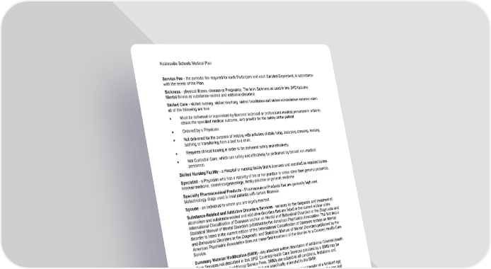 Noblesville Schools Medical Plan 109 Section 9: Defined Terms Service Fee - the periodic fee required for each Participant and each Enrolled Dependent, in accordance with the terms of the Plan. Sickness - physical illness, disease or Pregnancy. The term Sickness as used in this SPD includes Mental Illness or substance-related and addictive disorders. Skilled Care - skilled nursing, skilled teaching, skilled habilitation and skilled rehabilitation services when all of the following are true: • Must be delivered or supervised by licensed technical or professional medical personnel in order to obtain the specified medical outcome, and provide for the safety of the patient. • Ordered by a Physician. • Not delivered for the purpose of helping with activities of daily living, including dressing, feeding, bathing or transferring from a bed to a chair. • Requires clinical training in order to be delivered safely and effectively. • Not Custodial Care, which can safely and effectively be performed by trained non-medical personnel. Skilled Nursing Facility - a Hospital or nursing facility that is licensed and operated as required by law. Specialist - a Physician who has a majority of his or her practice in areas other than general pediatrics, internal medicine, obstetrics/gynecology, family practice or general medicine. Specialty Pharmaceutical Products - Pharmaceutical Products that are generally high cost biotechnology drugs used to treat patients with certain illnesses. Spouse - an individual to whom you are legally married. Substance-Related and Addictive Disorders Services - services for the diagnosis and treatment of alcoholism and substance-related and addictive disorders that are listed in the current edition of the International Classification of Diseases section on Mental and Behavioral Disorders or the Diagnostic and Statistical Manual of Mental Disorders published by the American Psychiatric Association. The fact that a disorder is listed in the current edition of the International Classification of Diseases section on Mental and Behavioral Disorders or the Diagnostic and Statistical Manual of Mental Disorders published by the American Psychiatric Association does not mean that treatment of the disorder is a Covered Health Care Service. Summary Material Modification (SMM) - any attached written description of additional Covered Health Care Services not described in this SPD. Covered Health Care Services provided by a SMM may be subject to payment of additional Service Fees. SMMs are subject to all conditions, limitations and exclusions of the Plan except for those that are specifically amended in the SMM. Surrogate - a female who becomes pregnant by artificial insemination or transfer of a fertilized egg (embryo) for the purpose of carrying the fetus for another person. A surrogate provides the egg and therefore is biologically (genetically) related to the child. Telehealth/Telemedicine - live, interactive audio with visual transmissions, and/or transmissions through federally compliant secure messaging applications of a Physician-patient encounter from one site to another using telecommunications technology. The site may be a CMS defined originating facility or another location such as a Covered Person's home or place of work. Telehealth/Telemedicine does not include virtual care services provided by a Designated Virtual Network Provider. Transitional Living - Mental Health Care Services and Substance-Related and Addictive Disorders Services provided through facilities, group homes and supervised apartments which provide 24-hour supervision, including those defined in the American Society of Addiction Medicine (ASAM) Criteria and are either: