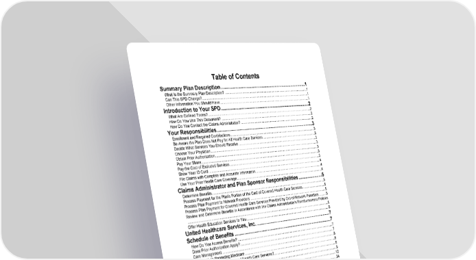 i Table of Contents Summary Plan Description........................................................................1 What Is the Summary Plan Description? ..................................................................................................1 Can This SPD Change?............................................................................................................................1 Other Information You Should Have .........................................................................................................1 Introduction to Your SPD...........................................................................2 What Are Defined Terms?.........................................................................................................................2 How Do You Use This Document? ...........................................................................................................2 How Do You Contact the Claims Administrator? ......................................................................................2 Your Responsibilities.................................................................................3 Enrollment and Required Contributions ....................................................................................................3 Be Aware the Plan Does Not Pay for All Health Care Services................................................................3 Decide What Services You Should Receive .............................................................................................3 Choose Your Physician.............................................................................................................................3 Obtain Prior Authorization.........................................................................................................................3 Pay Your Share.........................................................................................................................................3 Pay the Cost of Excluded Services...........................................................................................................3 Show Your ID Card ...................................................................................................................................4 File Claims with Complete and Accurate Information ...............................................................................4 Use Your Prior Health Care Coverage......................................................................................................4 Claims Administrator and Plan Sponsor Responsibilities .....................5 Determine Benefits....................................................................................................................................5 Process Payment for the Plan's Portion of the Cost of Covered Health Care Services............................5 Process Plan Payment to Network Providers ...........................................................................................5 Process Plan Payment for Covered Health Care Services Provided by Out-of-Network Providers .........5 Review and Determine Benefits in Accordance with the Claims Administrator's Reimbursement Policies ..................................................................................................................................................................5 Offer Health Education Services to You....................................................................................................6 United Healthcare Services, Inc. ...............................................................7 Schedule of Benefits ..................................................................................7 How Do You Access Benefits? .................................................................................................................7 Does Prior Authorization Apply? ...............................................................................................................7 Care Management ....................................................................................................................................8 Special Note Regarding Medicare ............................................................................................................8 What Will You Pay for Covered Health Care Services?............................................................................8 Payment Term and Description Table.......................................................................................................9 Schedule of Benefits Table .....................................................................................................................12 Allowed Amounts ....................................................................................................................................34 Designated Network Benefits and Network Benefits...............................................................................35 Out-of-Network Benefits..........................................................................................................................35 Advocacy Services..................................................................................................................................37 Provider Network.....................................................................................................................................37 Designated Providers..............................................................................................................................38 Health Care Services from Out-of-Network Providers Paid as Network Benefits ...................................38 Limitations on Selection of Providers......................................................................................................38 Section 1: Covered Health Care Services ..............................................39 When Are Benefi
