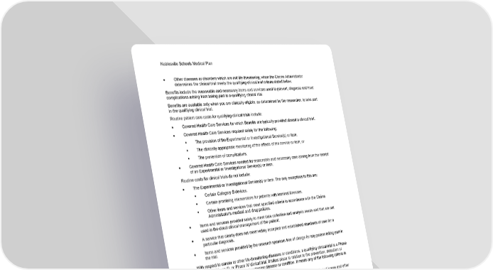 Noblesville Schools Medical Plan 41 Section 1: Covered Health Care Services • Other diseases or disorders which are not life threatening, when the Claims Administrator determines the clinical trial meets the qualifying clinical trial criteria stated below. Benefits include the reasonable and necessary items and services used to prevent, diagnose and treat complications arising from taking part in a qualifying clinical trial. Benefits are available only when you are clinically eligible, as determined by the researcher, to take part in the qualifying clinical trial. Routine patient care costs for qualifying clinical trials include: • Covered Health Care Services for which Benefits are typically provided absent a clinical trial. • Covered Health Care Services required solely for the following: ▪ The provision of the Experimental or Investigational Service(s) or item. ▪ The clinically appropriate monitoring of the effects of the service or item, or ▪ The prevention of complications. • Covered Health Care Services needed for reasonable and necessary care arising from the receipt of an Experimental or Investigational Service(s) or item. Routine costs for clinical trials do not include: • The Experimental or Investigational Service(s) or item. The only exceptions to this are: ▪ Certain Category B devices. ▪ Certain promising interventions for patients with terminal illnesses. ▪ Other items and services that meet specified criteria in accordance with the Claims Administrator's medical and drug policies. • Items and services provided solely to meet data collection and analysis needs and that are not used in the direct clinical management of the patient. • A service that clearly does not meet widely accepted and established standards of care for a particular diagnosis. • Items and services provided by the research sponsors free of charge for any person taking part in the trial. With respect to cancer or other life-threatening diseases or conditions, a qualifying clinical trial is a Phase I, Phase II, Phase III, or Phase IV clinical trial. It takes place in relation to the prevention, detection or treatment of cancer or other life-threatening disease or condition. It meets any of the following criteria in the bulleted list below. With respect to cardiovascular disease, musculoskeletal disorders of the spine, hip and knees and other diseases or disorders which are not life-threatening, a qualifying clinical trial is a Phase I, Phase II, or Phase III clinical trial. It takes place in relation to the detection or treatment of such non-life-threatening disease or disorder. It meets any of the following criteria in the bulleted list below. • Federally funded trials. The study or investigation is approved or funded (which may include funding through in-kind contributions) by one or more of the following: ▪ National Institutes of Health (NIH). (Includes National Cancer Institute (NCI).) ▪ Centers for Disease Control and Prevention (CDC). ▪ Agency for Healthcare Research and Quality (AHRQ). ▪ Centers for Medicare and Medicaid Services (CMS).