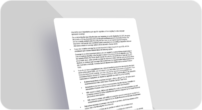 120 Federal Notice required to cover dependents up to age 26, regardless of their eligibility for other employer sponsored coverage. On or before the first day of the first plan year beginning on or after September 23, 2010, the group will provide a 30 day dependent child special open enrollment period for dependent children who are not currently enrolled under the policy and who have not yet reached age 26. During this dependent child special open enrollment period, subscribers who are adding a dependent child and who have a choice of coverage options will be allowed to change options. • If your plan includes coverage for enrolled dependent children beyond the age of 26, which is conditioned upon full-time student status, the following applies: Coverage for enrolled dependent children who are required to maintain full-time student status in order to continue eligibility under the plan is subject to the statute known as Michelle's Law. This law amends ERISA, the Public Health Service Act, and the Internal Revenue Code and requires group health plans, which provide coverage for dependent children who are post-secondary school students, to continue such coverage if the student loses the required student status because he or she must take a medically necessary leave of absence from studies due to a serious illness or Injury. • If you do not have a grandfathered plan, network benefits for preventive care services described below will be paid at 100%, and not subject to any deductible, Coinsurance or Copayment. If you have pharmacy benefit coverage, your plan may also be required to cover preventive care medications that are obtained at a network pharmacy at 100%, and not subject to any deductible, Coinsurance or Copayment, as required by applicable law under any of the following: ▪ Evidence-based items or services that have in effect a rating of "A" or "B" in the current recommendations of the United States Preventive Services Task Force. ▪ Immunizations that have in effect a recommendation from the Advisory Committee on Immunization Practices of the Centers for Disease Control and Prevention. ▪ With respect to infants, children and adolescents, evidence-informed preventive care and screenings provided for in the comprehensive guidelines supported by the Health Resources and Services Administration. ▪ With respect to women, such additional preventive care and screenings as provided for in comprehensive guidelines supported by the Health Resources and Services Administration. • Retroactive rescission of coverage under the plan is permitted, with 30 days advance written notice, only in the following two circumstances: ▪ The individual performs an act, practice or omission that constitutes fraud. ▪ The individual makes an intentional misrepresentation of a material fact. • Other changes provided for under the PPACA do not impact your plan because your plan already contains these benefits. These include: ▪ Direct access to OB/GYN care without a referral or authorization requirement. ▪ The ability to designate a pediatrician as a primary care physician (PCP) if your plan requires a PCP designation. ▪ Prior authorization is not required before you receive services in the emergency department of a hospital. If you seek emergency care from out-of-network providers in the emergency department of a hospital your cost sharing obligations (Copayments/Coinsurance) will be the same as would be applied to care received from network providers.