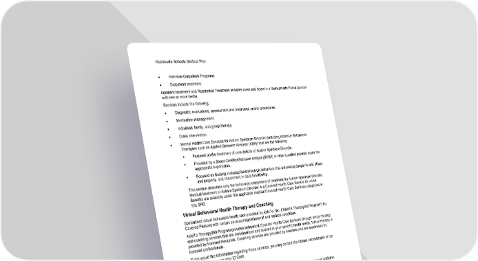 Noblesville Schools Medical Plan 48 Section 1: Covered Health Care Services • Intensive Outpatient Programs. • Outpatient treatment. Inpatient treatment and Residential Treatment includes room and board in a Semi-private Room (a room with two or more beds). Services include the following: • Diagnostic evaluations, assessment and treatment, and/or procedures. • Medication management. • Individual, family, and group therapy. • Crisis intervention. • Mental Health Care Services for Autism Spectrum Disorder (including Intensive Behavioral Therapies such as Applied Behavior Analysis (ABA)) that are the following: ▪ Focused on the treatment of core deficits of Autism Spectrum Disorder. ▪ Provided by a Board Certified Behavior Analyst (BCBA) or other qualified provider under the appropriate supervision. ▪ Focused on treating maladaptive/stereotypic behaviors that are posing danger to self, others and property, and impairment in daily functioning. This section describes only the behavioral component of treatment for Autism Spectrum Disorder. Medical treatment of Autism Spectrum Disorder is a Covered Health Care Service for which Benefits are available under the applicable medical Covered Health Care Services categories in this SPD. Virtual Behavioral Health Therapy and Coaching Specialized virtual behavioral health care provided by AbleTo, Inc. ("AbleTo Therapy360 Program") for Covered Persons with certain co-occurring behavioral and medical conditions. AbleTo Therapy360 Program provides behavioral Covered Health Care Services through virtual therapy and coaching services that are individualized and tailored to your specific health needs. Virtual therapy is provided by licensed therapists. Coaching services are provided by coaches who are supervised by licensed professionals. If you would like information regarding these services, you may contact the Claims Administrator at the telephone number on your ID Card. Non-Preventive Nutritional Counseling Non-preventive nutritional counseling services for mental health and substance-related and addictive disorders and medical diagnosis that are provided as part of treatment for a disease by appropriately licensed or registered health care professionals. When nutritional counseling services are billed as a preventive care service, these services will be paid as described under Preventive Care Services in this section. Ostomy Supplies Benefits for ostomy supplies are limited to the following: • Pouches, face plates and belts. • Irrigation sleeves, bags and ostomy irrigation catheters. • Skin barriers.