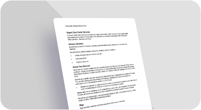 Noblesville Schools Medical Plan 55 Section 1: Covered Health Care Services Urgent Care Center Services Covered Health Care Services received at an Urgent Care Center. When services to treat urgent health care needs are provided in a Physician's office, Benefits are available as described under Physician's Office Services - Sickness and Injury. Urinary Catheters Benefits are provided for external, indwelling, and intermittent urinary catheters for incontinence or retention. Benefits include related urologic supplies for indwelling catheters limited to: • Urinary drainage bag and insertion tray (kit). • Anchoring device. • Irrigation tubing set. Virtual Care Services Virtual care for Covered Health Care Services that includes the diagnosis and treatment of less serious conditions. Virtual care provides communication of medical information in real-time between the patient and a distant Physician or health specialist, outside of a medical facility (for example, from home or from work). Benefits are available only when services are delivered through a Designated Virtual Network Provider. You can find a Designated Virtual Network Provider by contacting the Claims Administrator at www.myuhc.com or the telephone number on your ID card. • Benefits are available for urgent on-demand health care delivered through live audio with video or audio only technology for treatment of acute but non-emergency needs. Please Note: Not all conditions can be treated through virtual care. The Designated Virtual Network Provider will identify any condition for which treatment by in-person Physician contact is needed. Benefits do not include email, or fax and standard telephone calls, or for services that occur within medical facilities (CMS defined originating facilities). Wigs Wigs and other scalp hair prostheses regardless of the reason for hair loss.