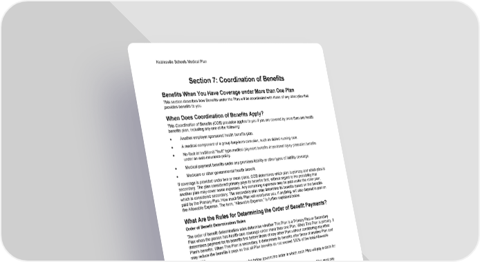 Noblesville Schools Medical Plan 83 Section 7: Coordination of Benefits Section 7: Coordination of Benefits Benefits When You Have Coverage under More than One Plan This section describes how Benefits under the Plan will be coordinated with those of any other plan that provides benefits to you. When Does Coordination of Benefits Apply? This Coordination of Benefits (COB) provision applies to you if you are covered by more than one health benefits plan, including any one of the following: • Another employer sponsored health benefits plan. • A medical component of a group long-term care plan, such as skilled nursing care. • No-fault or traditional "fault" type medical payment benefits or personal injury protection benefits under an auto insurance policy. • Medical payment benefits under any premises liability or other types of liability coverage. • Medicare or other governmental health benefit. If coverage is provided under two or more plans, COB determines which plan is primary and which plan is secondary. The plan considered primary pays its benefits first, without regard to the possibility that another plan may cover some expenses. Any remaining expenses may be paid under the other plan, which is considered secondary. The secondary plan may determine its benefits based on the benefits paid by the Primary Plan. How much this Plan will reimburse you, if anything, will also depend in part on the Allowable Expense. The term, “Allowable Expense,” is further explained below. What Are the Rules for Determining the Order of Benefit Payments? Order of Benefit Determination Rules The order of benefit determination rules determine whether This Plan is a Primary Plan or Secondary Plan when the person has health care coverage under more than one Plan. When This Plan is primary, it determines payment for its benefits first before those of any other Plan without considering any other Plan's benefits. When This Plan is secondary, it determines its benefits after those of another Plan and may reduce the benefits it pays so that all Plan benefits do not exceed 100% of the total Allowable Expense. The order of benefit determination rules below govern the order in which each Plan will pay a claim for benefits. • Primary Plan. The Plan that pays first is called the Primary Plan. The Primary Plan must pay benefits in accordance with its policy terms without regard to the possibility that another Plan may cover some expenses. • Secondary Plan. The Plan that pays after the Primary Plan is the Secondary Plan. The Secondary Plan may reduce the benefits it pays so that payments from all Plans do not exceed 100% of the total Allowable Expense. Allowable Expense is defined below. When a person is covered by two or more Plans, the rules for determining the order of benefit payments are as follows: A. This Plan will always be secondary to medical payment coverage or personal injury protection coverage under any auto liability or no-fault insurance policy. B. When you have coverage under two or more medical plans and only one has COB provisions, the plan without COB provisions will pay benefits first.