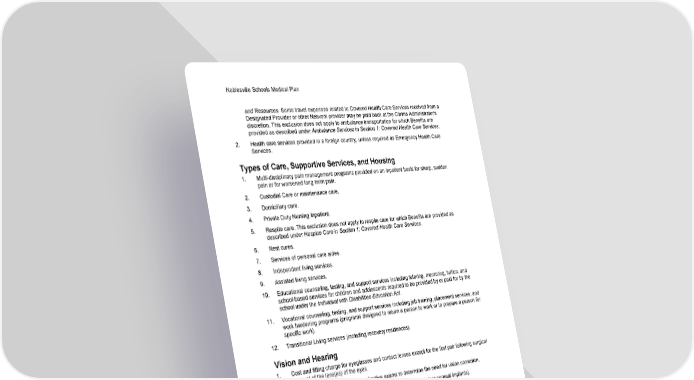 Noblesville Schools Medical Plan 65 Section 2: Exclusions and Limitations and Resources. Some travel expenses related to Covered Health Care Services received from a Designated Provider or other Network provider may be paid back at the Claims Administrator's discretion. This exclusion does not apply to ambulance transportation for which Benefits are provided as described under Ambulance Services in Section 1: Covered Health Care Services. 2. Health care services provided in a foreign country, unless required as Emergency Health Care Services. Types of Care, Supportive Services, and Housing 1. Multi-disciplinary pain management programs provided on an inpatient basis for sharp, sudden pain or for worsened long term pain. 2. Custodial Care or maintenance care. 3. Domiciliary care. 4. Private Duty Nursing Inpatient. 5. Respite care. This exclusion does not apply to respite care for which Benefits are provided as described under Hospice Care in Section 1: Covered Health Care Services. 6. Rest cures. 7. Services of personal care aides. 8. Independent living services. 9. Assisted living services. 10. Educational counseling, testing, and support services including tutoring, mentoring, tuition, and school-based services for children and adolescents required to be provided by or paid for by the school under the Individual with Disabilities Education Act. 11. Vocational counseling, testing, and support services including job training, placement services, and work hardening programs (programs designed to return a person to work or to prepare a person for specific work). 12. Transitional Living services (including recovery residences). Vision and Hearing 1. Cost and fitting charge for eyeglasses and contact lenses except for the first pair following surgical removal of the lens(es) of the eyes. 2. Routine vision exams, including refractive exams to determine the need for vision correction. 3. Implantable lenses used only to fix a refractive error (such as Intacs corneal implants). 4. Eye exercise or vision therapy. 5. Surgery that is intended to allow you to see better without glasses or other vision correction. Examples include radial keratotomy, laser and other refractive eye surgery. 6. Cost and related fitting and testing charges for hearing aids, bone anchored hearing aids and all other hearing assistive devices. 7. Over-the-counter hearing aids. All Other Exclusions 1. Health care services and supplies that do not meet the definition of a Covered Health Care Service. Covered Health Care Services are those health services, including services, supplies, or Pharmaceutical Products, which the Claims Administrator determines to be all of the following: