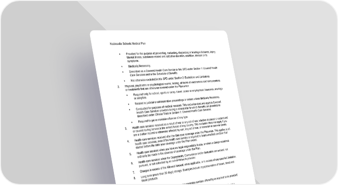 Noblesville Schools Medical Plan 66 Section 2: Exclusions and Limitations ▪ Provided for the purpose of preventing, evaluating, diagnosing or treating a Sickness, Injury, Mental Illness, substance-related and addictive disorders, condition, disease or its symptoms. ▪ Medically Necessary. ▪ Described as a Covered Health Care Service in this SPD under Section 1: Covered Health Care Services and in the Schedule of Benefits. ▪ Not otherwise excluded in this SPD under Section 2: Exclusions and Limitations. 2. Physical, psychiatric or psychological exams, testing, all forms of vaccinations and immunizations or treatments that are otherwise covered under the Plan when: ▪ Required only for school, sports or camp, travel, career or employment, insurance, marriage or adoption. ▪ Related to judicial or administrative proceedings or orders unless Medically Necessary. ▪ Conducted for purposes of medical research. This exclusion does not apply to Covered Health Care Services provided during a clinical trial for which Benefits are provided as described under Clinical Trials in Section 1: Covered Health Care Services. ▪ Required to get or maintain a license of any type. 3. Health care services received as a result of war or any act of war, whether declared or undeclared or caused during service in the armed forces of any country. This exclusion does not apply if you are a civilian injured or otherwise affected by war, any act of war, or terrorism in non-war zones. 4. Health care services received after the date your coverage under the Plan ends. This applies to all health care services, even if the health care service is required to treat a medical condition that started before the date your coverage under the Plan ended. 5. Health care services when you have no legal responsibility to pay, or when a charge would not ordinarily be made in the absence of coverage under the Plan. 6. Health care services when the Copayments, Coinsurance and/or deductible are waived, not pursued, or not collected by an out-of-Network provider. 7. Charges in excess of the Allowed Amount, when applicable, or in excess of any specified limitation. 8. Long term (more than 30 days) storage. Examples include cryopreservation of tissue, blood and blood products. 9. Autopsy. 10. Foreign language and sign language interpretation services offered by or required to be provided by a Network or out-of-Network provider. 11. Health care services related to a non-Covered Health Care Service: When a service is not a Covered Health Care Service, all services related to that non-Covered Health Care Service are also excluded. This exclusion does not apply to services the Claims Administrator would otherwise determine to be Covered Health Care Services if the service treats complications that arise from the non-Covered Health Care Service. For the purpose of this exclusion, a "complication" is an unexpected or unanticipated condition that is superimposed on an existing disease and that affects or modifies the prognosis of the original disease or condition. Examples of a "complication" are bleeding or infections, following a Cosmetic Procedure, that require hospitalization.