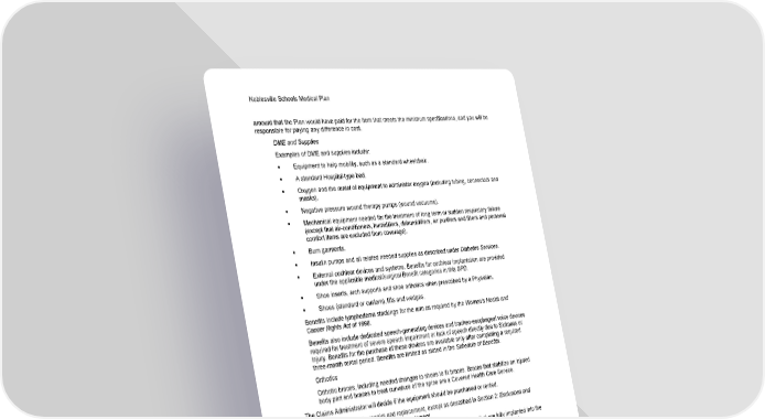 Noblesville Schools Medical Plan 44 Section 1: Covered Health Care Services amount that the Plan would have paid for the item that meets the minimum specifications, and you will be responsible for paying any difference in cost. DME and Supplies Examples of DME and supplies include: ▪ Equipment to help mobility, such as a standard wheelchair. ▪ A standard Hospital-type bed. ▪ Oxygen and the rental of equipment to administer oxygen (including tubing, connectors and masks). ▪ Negative pressure wound therapy pumps (wound vacuums). ▪ Mechanical equipment needed for the treatment of long term or sudden respiratory failure (except that air-conditioners, humidifiers, dehumidifiers, air purifiers and filters and personal comfort items are excluded from coverage). ▪ Burn garments. ▪ Insulin pumps and all related needed supplies as described under Diabetes Services. ▪ External cochlear devices and systems. Benefits for cochlear implantation are provided under the applicable medical/surgical Benefit categories in this SPD. ▪ Shoe inserts, arch supports and shoe orthotics when prescribed by a Physician. ▪ Shoes (standard or custom), lifts and wedges. Benefits include lymphedema stockings for the arm as required by the Women's Health and Cancer Rights Act of 1998. Benefits also include dedicated speech-generating devices and tracheo-esophageal voice devices required for treatment of severe speech impairment or lack of speech directly due to Sickness or Injury. Benefits for the purchase of these devices are available only after completing a required three-month rental period. Benefits are limited as stated in the Schedule of Benefits. Orthotics Orthotic braces, including needed changes to shoes to fit braces. Braces that stabilize an injured body part and braces to treat curvature of the spine are a Covered Health Care Service. The Claims Administrator will decide if the equipment should be purchased or rented. Benefits are available for repairs and replacement, except as described in Section 2: Exclusions and Limitations, under Medical Supplies and Equipment. These Benefits apply to external DME. Unless otherwise excluded, items that are fully implanted into the body are a Covered Health Care Service for which Benefits are available under the applicable medical/surgical Covered Health Care Service categories in this SPD. Emergency Health Care Services - Outpatient Services that are required to stabilize or begin treatment in an Emergency. Emergency Health Care Services must be received on an outpatient basis at a Hospital or Alternate Facility. Benefits include the facility charge, supplies and all professional services required to stabilize your condition and/or begin treatment. This includes placement in an observation bed to monitor your condition (rather than being admitted to a Hospital for an Inpatient Stay). Benefits are available for services to treat a condition that does not meet the definition of an Emergency.