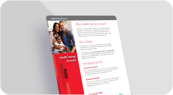 Healthcare is constantly changing. With rising out-of-pocket expenses and larger gaps in coverage, you need a solution. A Health Savings Account (HSA) might be the answer. Paired with a High Deductible Health Plan (HDHP), an HSA offers the security of knowing you have the funds needed to help cover healthcare costs before you meet your deductible. Why a Health Savings Account? How It Works An HSA allows you to set aside money pre-tax to help pay for eligible medical expenses. Your contributions can build year over year and any interest you earn will grow tax-free. To participate in an HSA, you must first be enrolled in a qualified HDHP. You may be enrolled in the plan either through your employer or spouse’s plan. Combining a qualified HDHP with an HSA helps you control your healthcare costs and expenses. Potential for Growth The money you put into the account is deducted from your paycheck tax- free. The interest and earnings you make on the account grow tax-free, with the opportunity to invest in mutual funds. Triple-Tax Advantage An Account You Own Like a personal savings account, the money in an HSA rolls over annually, meaning the funds never expire and you can take it with you wherever you go – even if you change jobs, change health plans or retire. The Value of an HSA The money you put into the account is deducted from your paycheck tax-free.** When you take money out for eligible medical expenses, it is generally tax-free. The interest and earnings you make on the account grow tax-free, with the opportunity to invest in mutual funds.* *This is not a guarantee of future performances. Your investment is connected to the stock market and is subject to rise or fall. ** HSA contributions are not subject to federal and most states’ income tax. State income tax may apply in California and New Jersey. Please consult a tax advisor for your state’s specific rules. Health Savings Accounts Health Savings Accounts