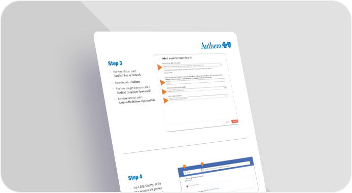 Step 3 ƕ For type of care, select Medical Pan or Network ƕ For state, select Indiana ƕ For how you get insurance, select Medical (Employer-Sponsored) ƕ For plan/network select Anthem HealthSync Options POS Step 4 ƕ Input City, County, or Zip (The program will provide dropdown boxes for you to select a City and State) ƕ Input Search for care. Most popular search is General/Acute Hospital or Primary Care (Doctor) ƕ You can also input your doctor’s name or name of hospital in the search function. The search feature will provide names for you to select. HINT: You can click on any of these options for frequently searched care options.