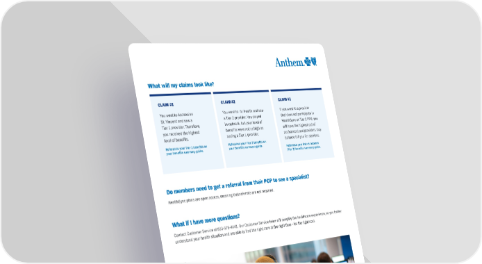 What will my claims look like? CLAIM #1 CLAIM #2 CLAIM #3 You went to Ascension You went to IU Health and saw If you went to a provider St. Vincent and saw a a Tier 2 provider. You stayed that does not participate in Tier 1 provider. Therefore, in-network, but your level of HealthSync or Tier 2 PPO, you you received the highest benefits were not as high as will have the highest out of level of benefits. seeing a Tier 1 provider. pocket cost and providers may Reference your Tier 1 benefits on Reference your Tier 2 benefits on balance bill you for services. your benefits summary guide. your benefits summary guide. Reference your Out-of-network (Tier 3) benefits summary guide. Do members need to get a referral from their PCP to see a specialist? HealthSync plans are open access, meaning that referrals are not required. What if I have more questions? Contact Customer Service at 833-578-4441. Our Customer Service team will simplify the healthcare experience, so you better understand your health situation and are able to find the right care at the right time – for the right cost. Anthem Blue Cross and Blue Shield is the trade name of Anthem Insurance Companies, Inc. Independent licensee of the Blue Cross and Blue Shield Association. Anthem is a registered trademark of Anthem Insurance Companies, Inc.