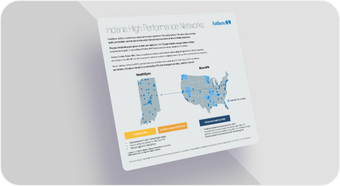 Indiana High Performance Networks HealthSync, Anthem’s current value-based care includes HealthSync POS and HealthSync 3-Tier plans. All provide high- quality, synchronized care that lead to lower costs, improved outcomes, and an enhanced member experience. This year, Anthem has a new option—Anthem Link HealthSync HMO. This plan extends coverage outside of Indiana SM SM using the Blue High Performance Network (Blue HPN ) where members are in-network in 55+ markets. Anthem Link HealthSync HMO o昀昀ers comprehensive medical combined with enhanced digital capabilities to deliver integrated, performance-based health care that can provide signi昀椀cant savings to employers, members, and the overall health care community. We will continue to have the POS plans that have been available in the market since 2018. Starting in 2021 we will have new Anthem Link plans connected to our national Blue HPN which leverages our existing HealthSync network. HealthSync Blue HPN Statewide MSA coverage HealthSync POS HealthSync Options POS (3 Tier) 1 Anthem Link HealthSync HMO • Seamless network within Central Region states 2 • Outside of the Central Region - BlueCard PPO • Portable and seamless access across 55+ MSAs • This plan applies to large groups • In network only coverage for providers that are part of Blue HPN (within IN, members use HealthSync providers for in-network coverage) • This plan applies to both small groups (SG) and large groups 1 Anthem Link HMO replaces HealthSync HMO e昀昀ective 12/31/2020 2 MSA number and coverage are subject to change Anthem Blue Cross and Blue Shield is the trade name of Anthem Insurance Companies, Inc. Independent licensee of the Blue Cross and Blue Shield Association. Anthem is a registered trademark of Anthem Insurance Companies, Inc.
