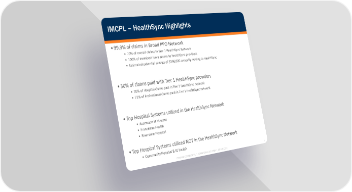 IMCPL – HealthSync Highlights •99.9% of claims in Broad PPO Network • 70% of overall claims in Tier 1 HealthSync Network • 100% of members have access to HealthSync providers • Estimated potential savings of $346,000 annually moving to HealthSync •30% of claims paid with Tier 1 HealthSync providers • 30% of Hospital claims paid in Tier 1 HealthSync network • 72% of Professional claims paid in Tier 1 HealthSync network •Top Hospital Systems utilized in the HealthSync Network • Ascension St Vincent • Franciscan Health • Riverview Hospital •Top Hospital Systems utilized NOT in the HealthSync Network • Community Hospital & IU Health COMPANY CONFIDENTIAL | FOR INTERNAL USE ONLY | DO NOT COPY 1