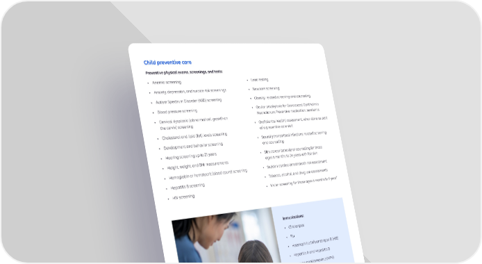 Immunizations: • Chickenpox • Flu • Haemophilus influenza type B (HIB) • Hepatitis A and Hepatitis B • Human papillomavirus (HPV) • Meningitis • Measles, mumps, and rubella (MMR) • Pneumonia • Polio • Respiratory syncytial virus (RSV) • Rotavirus • Severe acute respiratory syndrome coronavirus 2 (SARS CoV 2)(COVID-19) • Whooping cough Child preventive care Preventive physical exams, screenings, and tests: • Anemia screening • Anxiety, depression, and suicide risk screenings • Autism Spectrum Disorder (ASD) screening • Blood pressure screening • Cervical dysplasia (abnormal cell growth on the cervix) screening • Cholesterol and lipid (fat) levels screening • Development and behavior screening • Hearing screening up to 21 years • Height, weight, and BMI measurements • Hemoglobin or hematocrit (blood count) screening • Hepatitis B screening • HIV screening • Lead testing • Newborn screening • Obesity: related screening and counseling • Ocular prophylaxis for Gonococcal Ophthalmia Neonatorum: Preventive medication: newborns • Oral (dental health) assessment, when done as part of a preventive care visit • Sexually transmitted infections: related screening and counseling • Skin cancer behavioral counseling for those ages 6 months to 24 years with fair skin • Sudden cardiac arrest/death risk assessment • Tobacco, alcohol, and drug use assessments • Vision screening for those ages 6 months to 5 year 9