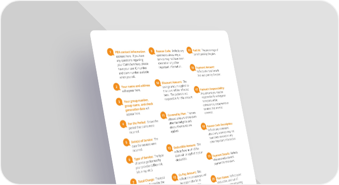 1 PBA contact information 9 Reason Code: Reflects any 15 Paid At: The percentage of appears here. If you have comments about why a benefit paid by the plan. any questions regarding service may not have been your Claim Summary, please covered or any other have your user ID number im portant information. 16 Payment Amount: and claim number available Reflects the total benefit when you call. that was paid by the plan. 2 Your name and address 10 Discount Amount: The will appear here. savings amount applied to this claim will be reflected 17 Patient’s Responsibility: 3 here. The patient is not Any amount you may be Your group number, responsible for this amount. responsible for will appear group name, and check here (deductible, generation date will coinsurance, copayments or appear here. services that are not 11 Covered by Plan: The new covered). 4 For the Period: Shows the allowed amount of the claim period that claims were after the ineligible and incurred. discount amounts are 18 Reason Code Description: applied. 5 Date(s) of Service: The Reflects any comments abo date the services were ut why a service may not incurred. have been covered or any 12 Deductible Amount: This other important information. 6 Type of Service: The type reflects how much of the of service performed by claim will be applied to your your provider (office visit, deductible. 19 Payment Details: Reflects lab, x-ray, etc.). who received a benefit payment for this claim. 7 Total Charge: The total 13 Co-Pay Amount: This amount charged by the reflects the amount you will provider. be responsible for as 20 Plan Status: Reflects your defined by your plan. deductible, and out-of- 8 Ineligible Amount: Any pocket amounts remaining amount not covered by the as defined by your plan. plan. Ineligible Amount will 14 be further explained with a Balance Amount: The reason code description in amount after all deductions section 18 and may be (ineligible, discount, 21 You Should Know: Special included in the amount you deductible, and co-pay reminders and amounts) are applied. announcements a may owe. ppear here. (630) 655-3755