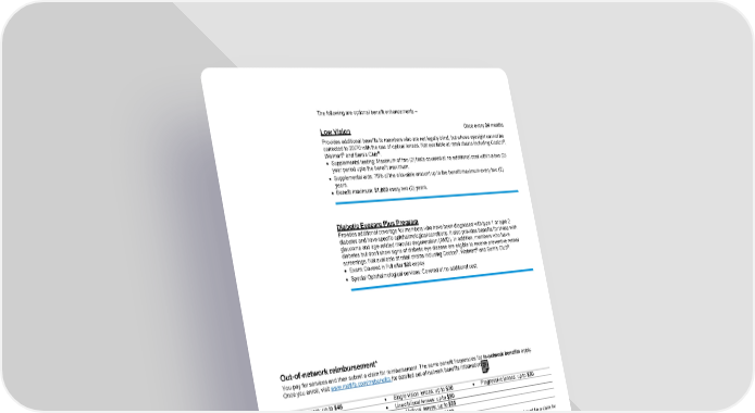 200 Park Ave., New York, NY 10166 L0423030985[exp0426][All States] © 2024 MetLife Services and Solutions, LLC The following are optional benefit enhancements – Low Vision Once every 24 months Provides additional benefits to members who are not legally blind, but whose eyesight cannot be corrected to 20/70 with the use of optical lenses. Not available at retail chains including Costco®, Walmart® and Sam’s Club®. • Supplemental testing: Maximum of two (2) tests covered at no additional cost within a two (2) year period up to the benefit maximum. • Supplemental aids: 75% of the allowable amount up to the benefit maximum every two (2) years. • Benefit maximum: $1,000 every two (2) years. Diabetic Eyecare Plus Program Provides additional coverage for members who have been diagnosed with type 1 or type 2 diabetes and have specific ophthalmological conditions. It also provides benefits for those with glaucoma and age-related macular degeneration (AMD). In addition, members who have diabetes but don't show signs of diabetic eye disease are eligible to receive preventive retinal screenings. Not available at retail chains including Costco®, Walmart® and Sam’s Club®. • Exam: Covered in Full after $20 copay. • Special Ophthalmological services: Covered at no additional cost. Out-of-network reimbursement* You pay for services and then submit a claim for reimbursement. The same benefit frequencies for In-network benefits apply. Once you enroll, visit www.metlife.com/mybenefits for detailed out-of-network benefits information. • Eye exam: up to $45 • Single vision lenses: up to $30 • Progressive lenses: up to $50 • Frames: up to $70 • Lined bifocal lenses: up to $50 • Contact lenses: • Lined trifocal lenses: up to $65 • Elective up to $105 • Lenticular lenses: up to $100 • Necessary up to $210 *If you choose an out-of-network provider, you may have increased out-of-pocket expenses, must pay in full at time of service, and must file a claim for reimbursement. Low Vision: • Supplemental evaluation and aids: Same as in-network benefits. Diabetic Eyecare Plus Program: • Exam and other ophthalmological services - The lesser of the provider’s usual fee or up to 80% of the Medicare allowable charge.