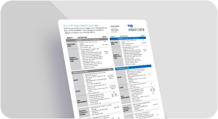 Your VSP Vision Benefits Summary Prioritize your health and your budget with a VSP plan through BALL STATE UNIVERSITY. Get coverage for essentials, or upgrade to enhance your coverage options. COPAY DESCRIPTION BENEFIT COPAY DESCRIPTION BENEFIT Premium Coverage with a VSP Provider Standard Coverage with a VSP Doctor $0 WELLVISION EXAM $15 WELLVISION EXAM Focuses on your eyes and overall wellness Focuses on your eyes and overall wellness Up to $39 Up to $39 Routine retinal screening Routine retinal screening Every calendar year Every calendar year ESSENTIAL MEDICAL EYE CARE ESSENTIAL MEDICAL EYE CARE Retinal imaging for members with diabetes covered-in-full Retinal imaging for members with diabetes covered-in-full $20 per exam $20 per exam Additional exams and services beyond routine care to treat immediate issues from pink eye to sudden changes in vision or to monitor ongoing conditions such as dry eye, diabetic eye disease, glaucoma, and more. Additional exams and services beyond routine care to treat immediate issues from pink eye to sudden changes in vision or to monitor ongoing conditions such as dry eye, diabetic eye disease, glaucoma, and more. Coordination with your medical coverage may apply. Ask your VSP network doctor for details. Coordination with your medical coverage may apply. Ask your VSP network doctor for details. Available as needed Available as needed PRESCRIPTION GLASSES $25 PRESCRIPTION GLASSES Included in Prescription Glasses FRAME⁺ $0 FRAME⁺ $170 Featured Frame Brands allowance $250 Featured Frame Brands allowance $150 frame allowance $250 Visionworks or Eyemart Express frame allowance on any frame 20% savings on the amount over your allowance $200 frame allowance $80 Walmart/Sam's Club/Costco frame allowance 20% savings on the amount over your allowance Every other calendar year $110 Walmart/Sam's Club/Costco frame allowance Included in Prescription Glasses LENSES Single vision, lined bifocal, and lined trifocal lenses Every calendar year $0 LENSES Impact-resistant lenses for dependent children Single vision, lined bifocal, and lined trifocal lenses Every calendar year Every calendar year $0 LENS ENHANCEMENTS $0 LENS ENHANCEMENTS Standard progressive lenses Standard progressive lenses $95 - $105 Premium progressive lenses $95 - $105 Premium progressive lenses $150 - $175 Custom progressive lenses $150 - $175 Custom progressive lenses Average savings of 30% on other lens enhancements $0 Impact-resistant lenses $0 UV protection Every calendar year Average savings of 30% on other lens enhancements Up to $60 CONTACTS (INSTEAD OF GLASSES) Every calendar year $150 allowance for contacts; copay does not apply Up to $60 CONTACTS (INSTEAD OF GLASSES) Contact lens exam (fitting and evaluation) $200 allowance for contacts; copay does not apply Every calendar year Contact lens exam (fitting and evaluation) $25 VSP LIGHTCARE TM+ $150 allowance for ready-made non-prescription sunglasses, or ready-made non-prescription blue light filtering glasses, instead of prescription glasses or contacts. Every calendar year VSP LIGHTCARE TM⁺ $0 $200 allowance for ready-made non-prescription sunglasses, or ready-made non-prescription blue light filtering glasses, instead of prescription glasses or contacts Every calendar year Every calendar year Glasses and Sunglasses ADDITIONAL SAVINGS Discover all current eyewear offers and savings at vsp.com/offers. 20% savings on unlimited additional pairs of prescription or non-prescription glasses/sunglasses, including lens enhancements, from a VSP provider within 12 months of your last WellVision Exam. Laser Vision Correction Average of 15% off the regular price; discounts available at contracted facilities. Exclusive Member Extras for VSP Members Contact lens rebates, lens satisfaction guarantees, and more offers at vsp.com/offers. Save up to 60% on digital hearing aids with TruHearing®. Visit vsp.com/offers/special-offers/hearing-aids for details. Enjoy everyday savings on health, wellness, and more with VSP Simple Values. GET MORE AT PREFERRED IN-NETWORK LOCATIONS With so many in-network choices, VSP makes it easy to get the most out of your benefits. You’ll have access to preferred private practice, retail, and online in-network choices. Log in to vsp.com to find an in-network provider. Provider Network: VSP Choice Effective Date: 01/01/2026