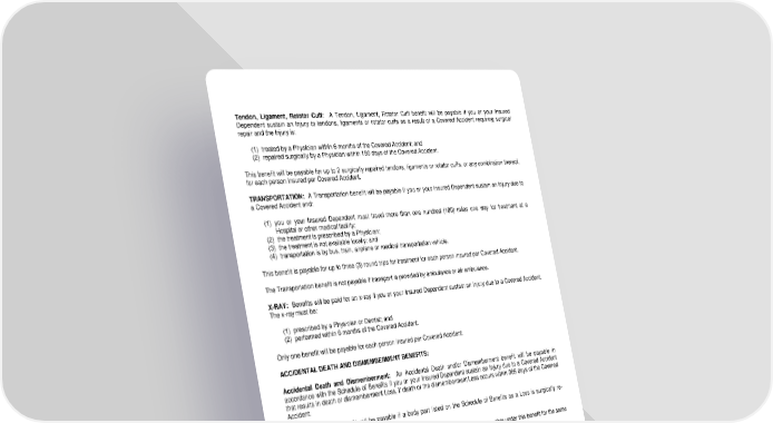 Tendon, Ligament, Rotator Cuff: A Tendon, Ligament, Rotator Cuff benefit will be payable if you or your Insured Dependent sustain an Injury to tendons, ligaments or rotator cuffs as a result of a Covered Accident requiring surgical repair and the Injury is: (1) treated by a Physician within 6 months of the Covered Accident; and (2) repaired surgically by a Physician within 180 days of the Covered Accident. This benefit will be payable for up to 2 surgically repaired tendons, ligaments or rotator cuffs, or any combination thereof, for each person insured per Covered Accident. TRANSPORTATION: A Transportation benefit will be payable if you or your Insured Dependent sustain an Injury due to a Covered Accident and: (1) you or your Insured Dependent must travel more than one hundred (100) miles one way for treatment at a Hospital or other medical facility; (2) the treatment is prescribed by a Physician; (3) the treatment is not available locally; and (4) transportation is by bus, train, airplane or medical transportation vehicle. This benefit is payable for up to three (3) round trips for treatment for each person insured per Covered Accident. The Transportation benefit is not payable if transport is provided by ambulance or air ambulance. X-RAY: Benefits will be paid for an x-ray if you or your Insured Dependent sustain an Injury due to a Covered Accident. The x-ray must be: (1) prescribed by a Physician or Dentist; and (2) performed within 6 months of the Covered Accident. Only one benefit will be payable for each person insured per Covered Accident. ACCIDENTAL DEATH AND DISMEMBERMENT BENEFITS: Accidental Death and Dismemberment: An Accidental Death and/or Dismemberment benefit will be payable in accordance with the Schedule of Benefits if you or your Insured Dependent sustain an Injury due to a Covered Accident that results in death or dismemberment Loss, if death or the dismemberment Loss occurs within 365 days of the Covered Accident. A Dismemberment benefit will be payable if a body part listed on the Schedule of Benefits as a Loss is surgically re- attached. If a Catastrophic Loss benefit is payable for a Covered Accident, no benefit will be payable under this benefit for the same Loss. Common Carrier: A Common Carrier benefit will be payable in addition to the Accidental Death Benefit if you or your Insured Dependent sustain an Injury due to a Covered Accident on a Common Carrier, as defined, which results in death within 365 days of the Covered Accident. Catastrophic Loss: A Catastrophic Loss benefit will be payable if you or your Insured Dependent sustain an Injury due to a Covered Accident that results in a Catastrophic Loss if such Loss occurs within 365 days of the Covered Accident. The benefit payable is shown on the Schedule of Benefits. If a Catastrophic Loss benefit is payable for a Covered Accident, no benefit will be payable under the Accidental Dismemberment benefit for the same Loss. The total benefit payable under this benefit cannot exceed that of the Accidental Death benefit. LRS-9548-0318-IN Page 7.6