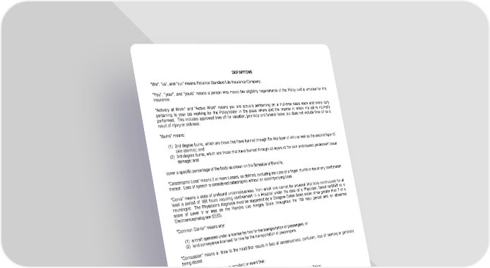 DEFINITIONS "We", "us", and "our" means Reliance Standard Life Insurance Company. "You", "your", and "yours" means a person who meets the eligibility requirements of the Policy and is enrolled for this insurance. "Actively at Work" and "Active Work" means you are actually performing on a Full-time basis each and every duty pertaining to your job working for the Policyholder in the place where and the manner in which the job is normally performed. This includes approved time off for vacation, jury duty and funeral leave, but does not include time off as a result of injury or sickness. "Burns" means: (1) 2nd degree burns, which are those that have burned through the first layer of skin as well as the second layer of skin (dermis); and (2) 3rd degree burns, which are those that have burned through all layers of the skin and causes permanent tissue damage; and cover a specific percentage of the body as shown on the Schedule of Benefits. "Catastrophic Loss" means 2 or more Losses, as defined, excluding the Loss of a finger, thumb or toe or any combination thereof. Loss of speech is considered catastrophic without an accompanying Loss. "Coma" means a state of profound unconsciousness, from which one cannot be aroused, that lasts continuously for at least a period of 168 hours requiring confinement in a Hospital under the care of a Physician, board certified as a neurologist. The Physician’s diagnosis must be supported by a Glasgow Coma Scale score of no greater than 7 or a score of Level V or less on the Rancho Los Amigos Scale throughout the 168 hour period and an abnormal Electroencephalogram (EEG). "Common Carrier" means any: (1) aircraft operated under a license for hire for the transportation of passengers; or (2) land conveyance licensed for hire for the transportation of passengers. "Concussion" means a blow to the head that results in loss of consciousness, confusion, loss of memory or generally being dazed. "Covered Accident" means an accident or event that: (1) could not have been foreseen, anticipated or expected; (2) occurs while your or your Insured Dependents coverage is in force under the Policy; (3) occurs on or off the job; (4) results in Injury for which benefits may be payable; and (5) is not excluded under the terms of the Policy. "Dentist" means a licensed doctor of dentistry, operating within the scope of his or her license, in the jurisdiction in which such license was issued. The Dentist may not be you or a member of your Immediate Family.. "Dependents" means: (1) your legal spouse; and (2) your child(ren), from birth to 26 years, including natural children, legally adopted children, children who are dependent on you during the waiting period before adoption, stepchildren, foster children and children under your legal guardianship; and (3) your child(ren) beyond the limiting age who is incapable of self-sustaining employment by reason of intellectual disability or physical handicap and who is chiefly dependent on you for support and maintenance. LRS-9548-0318-IN Page 2.0