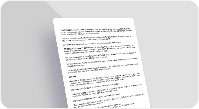 PROSTHESIS: A Prosthesis benefit will be payable if you or your Insured Dependent require a prosthetic limb as a result of Injury sustained due to a Covered Accident if such prosthesis is prescribed by a Physician and received by you or your Insured Dependent within 365 days of the Covered Accident. If the Injury sustained is considered a Catastrophic Loss as defined, a Physician must prescribe the prosthesis and you or your Insured Dependent must receive it within 2 years of the Covered Accident. Only one benefit is payable per limb, up to 2 limbs for each person insured per Covered Accident. REHABILITATION FACILITY CONFINEMENT: A Rehabilitation Facility Confinement benefit will be payable for each day you or your Insured Dependent are confined in a Rehabilitation Facility because of Injury sustained due to a Covered Accident if confinement begins within 180 days of the Covered Accident. This benefit is payable per day for up to thirty (30) days for each person insured per Covered Accident over the course of 365 days from the date of initial Rehabilitation Facility Confinement. Only one Rehabilitation Facility Confinement benefit is payable regardless of whether more than one Covered Accident caused such confinement. The Rehabilitation Facility Confinement benefit is not payable for any day that you or your Insured Dependent receive benefits under the Hospital Confinement or ICU Confinement benefits. SURGERY: Abdominal or Thoracic Surgery: An Abdominal or Thoracic Surgery benefit will be payable if you or your Insured Dependent sustain an Injury as a result of a Covered Accident that is diagnosed as requiring abdominal or thoracic surgery and has surgical treatment by a Physician within 72 hours of the Covered Accident. Only one benefit will be payable for each person insured per Covered Accident. Exploratory Surgery: An Exploratory Surgery benefit will be payable for exploratory surgery for the procedures listed under Surgery Benefits if such surgery is performed and no repair is done. Only one benefit will be payable for each person insured per Covered Accident. Knee Cartilage: A Knee Cartilage benefit will be payable if you or your Insured Dependent sustain torn cartilage in the knee due to a Covered Accident and the Injury is: (1) treated by a Physician within 6 months of the Covered Accident; and (2) repaired or removed through surgery by a Physician within 365 days of the Covered Accident. Only one benefit will be payable per knee for each person insured per Covered Accident. Ruptured Disc: A Ruptured Disc benefit will be payable if you or your Insured Dependent sustain a ruptured disc in the spine as a result of a Covered Accident requiring surgical repair if the Injury is: (1) treated by a Physician within 6 months of the Covered Accident; and (2) repaired surgically by a Physician within 365 days of the Covered Accident. Only one benefit will be payable for each person insured per Covered Accident. LRS-9548-0318-IN Page 7.5